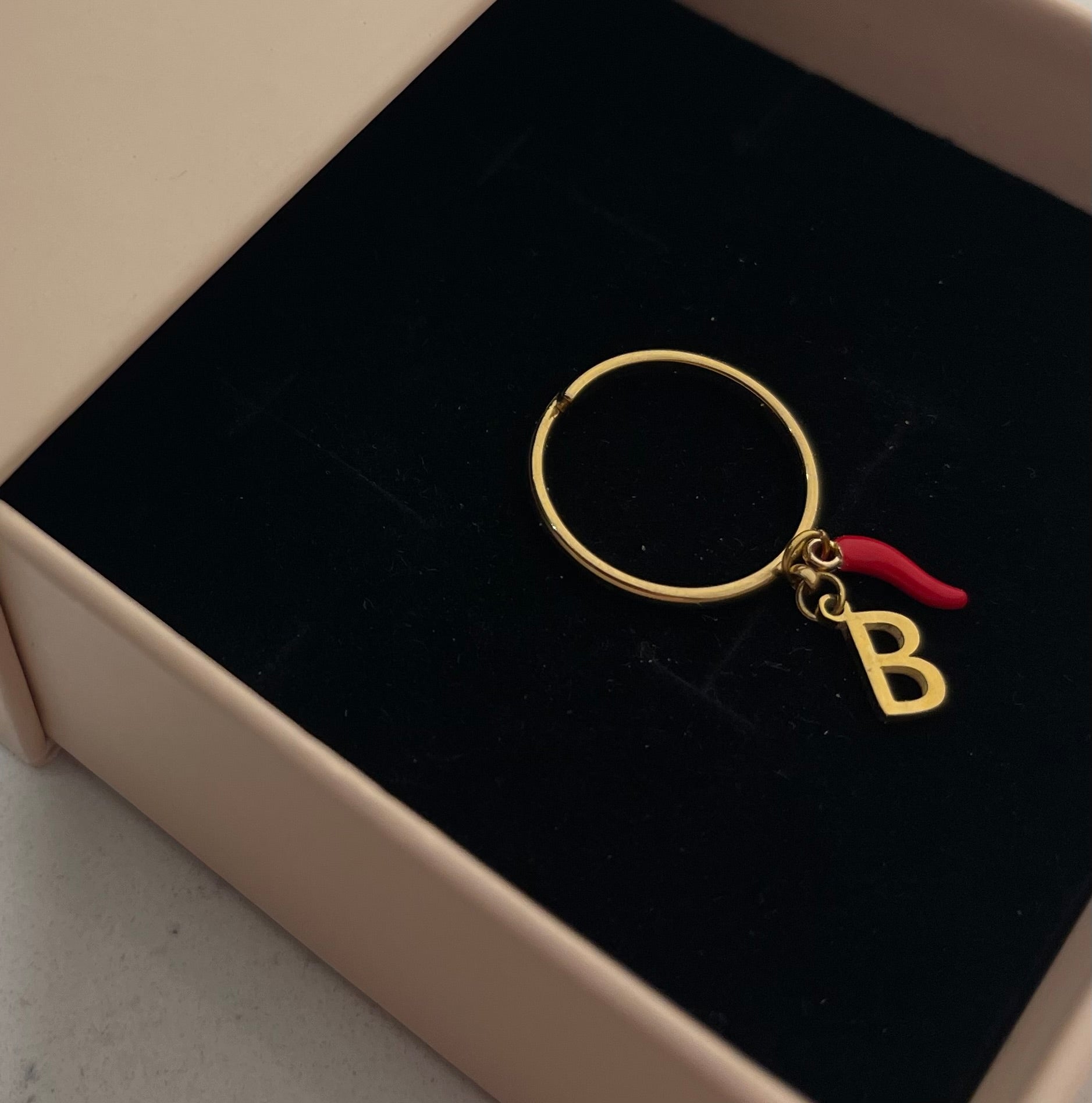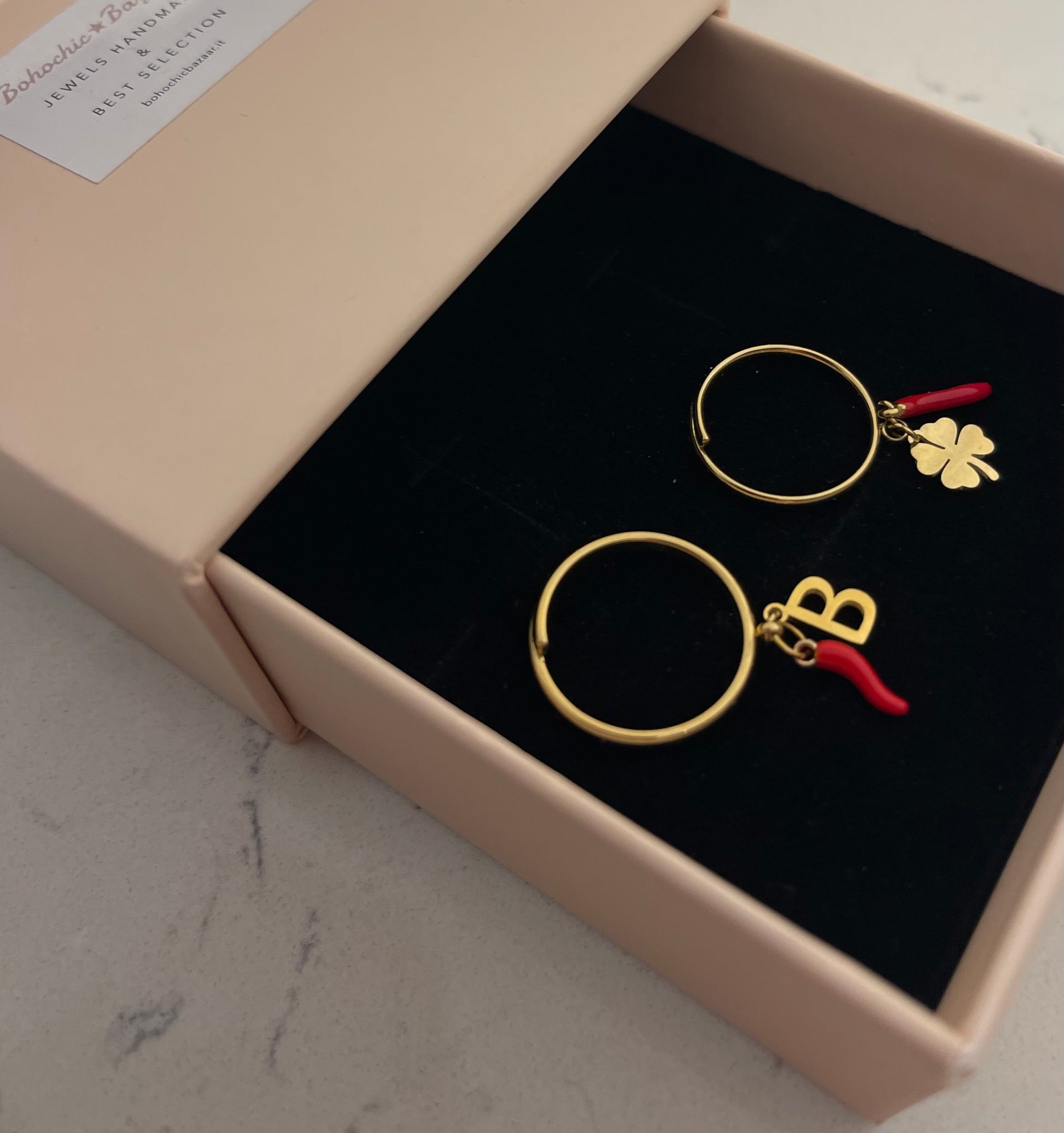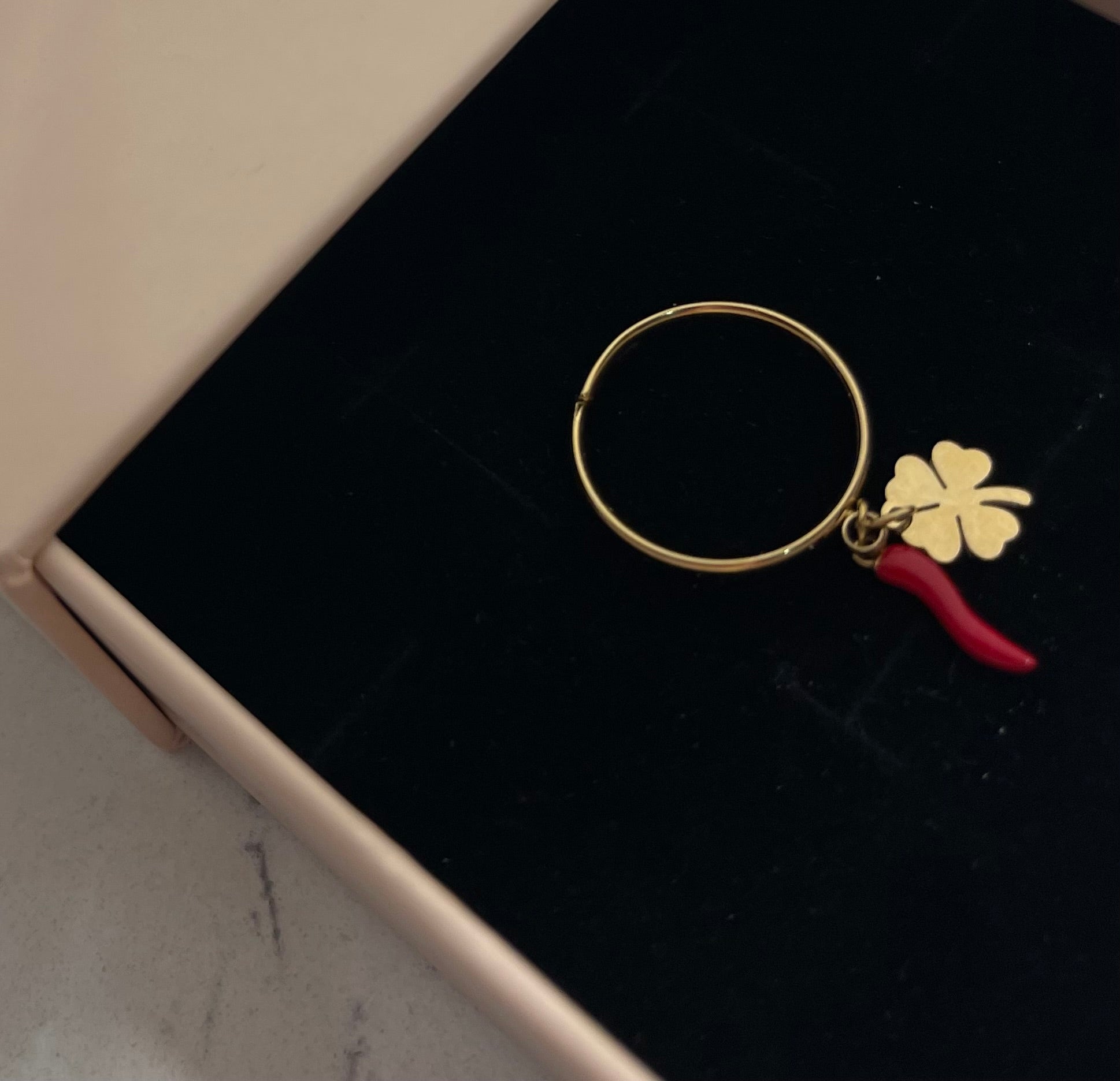 Anellino regolabile, Charms pendenti . var. Con ciondolo cornetto e quadrifoglio e var. Cornetto e iniziale personalizzabile , da indicare nelle note al check out.