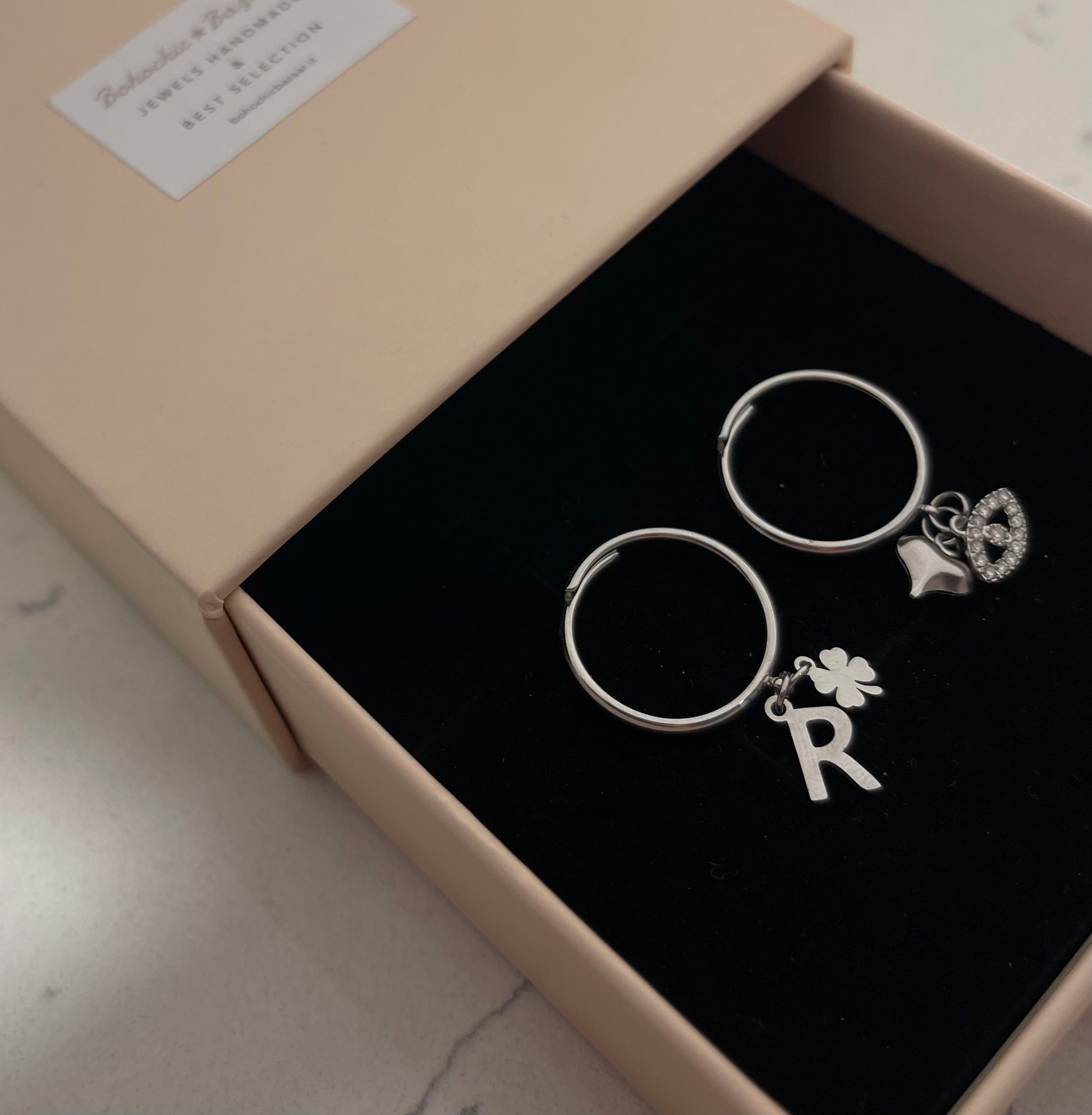 var 1 iniziale personalizzabile e quadrifoglio ( indica la latterà che vuoi ricevere nel tuo anello, nelle note al checkout) var2 cuoricino bombato e occhietto Zirconato