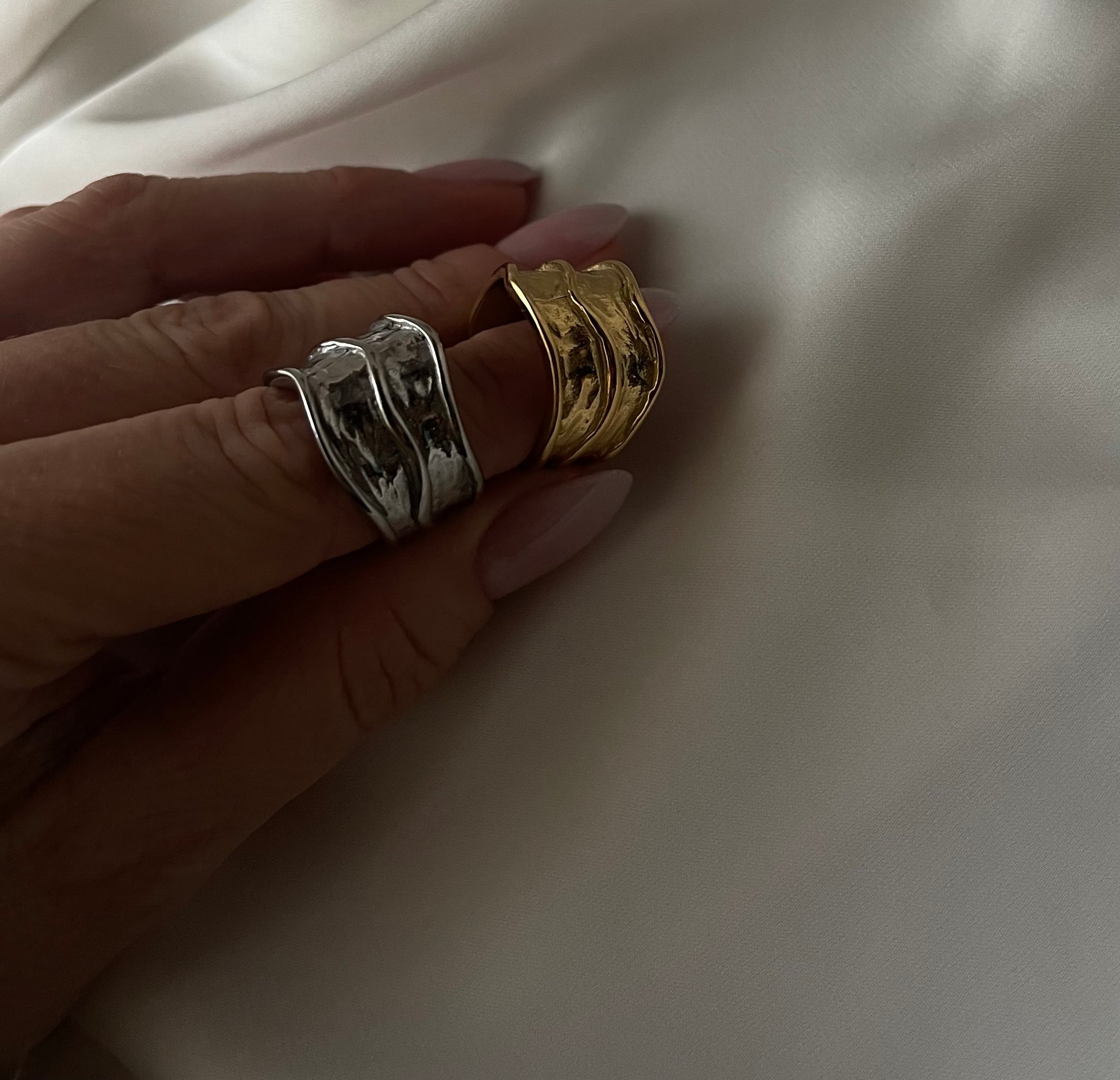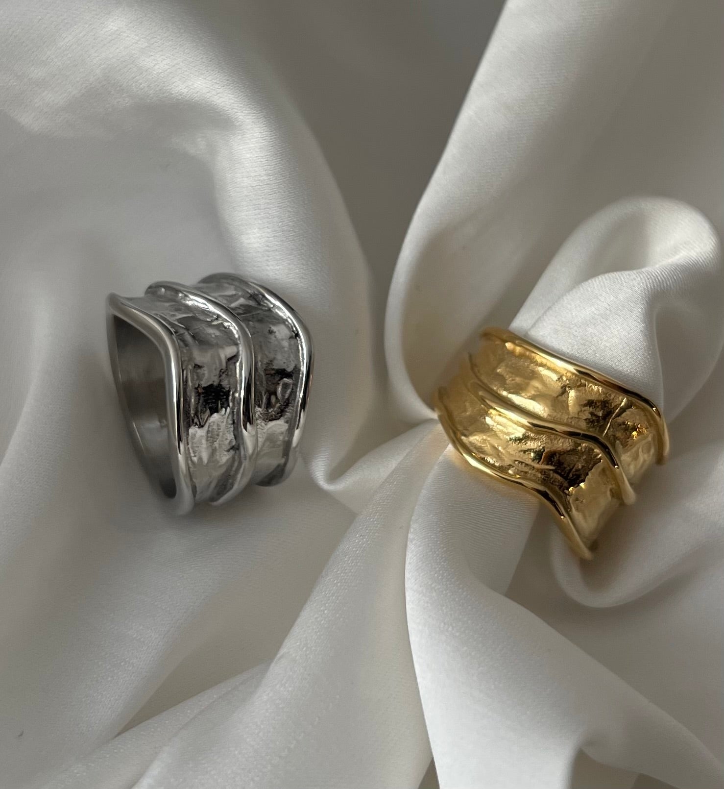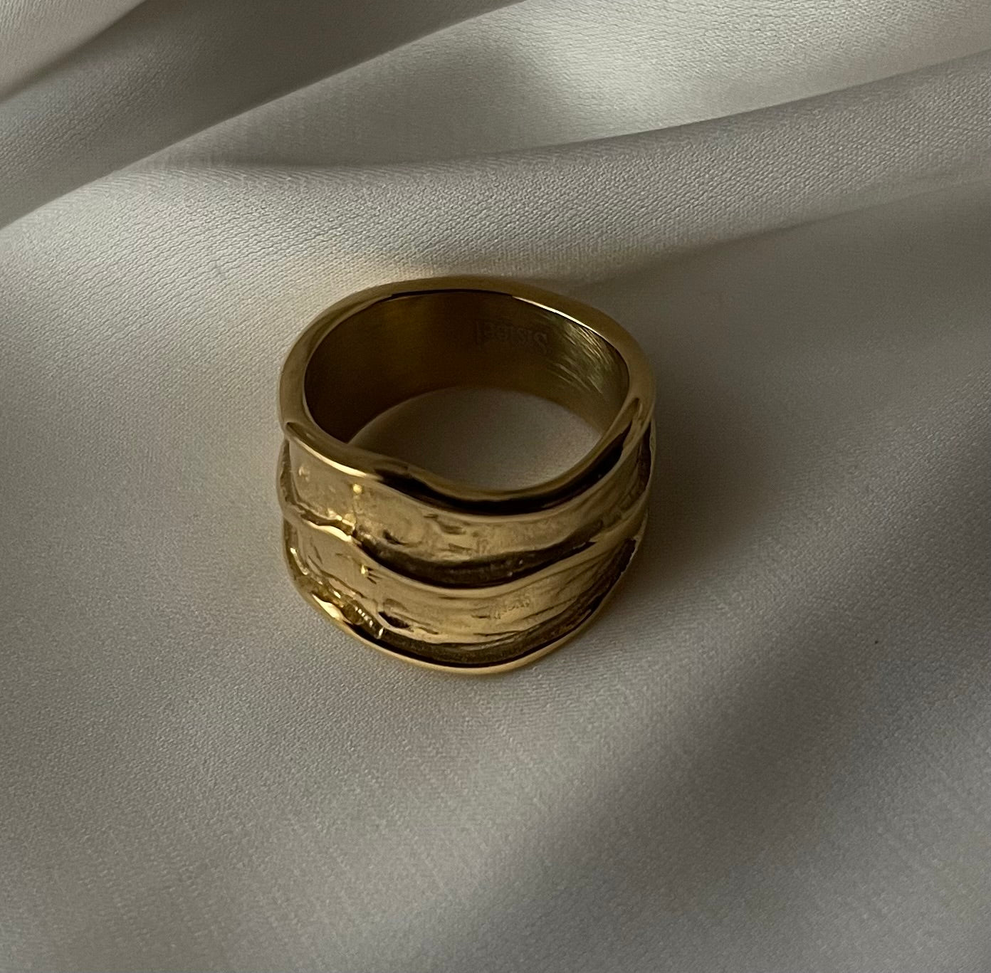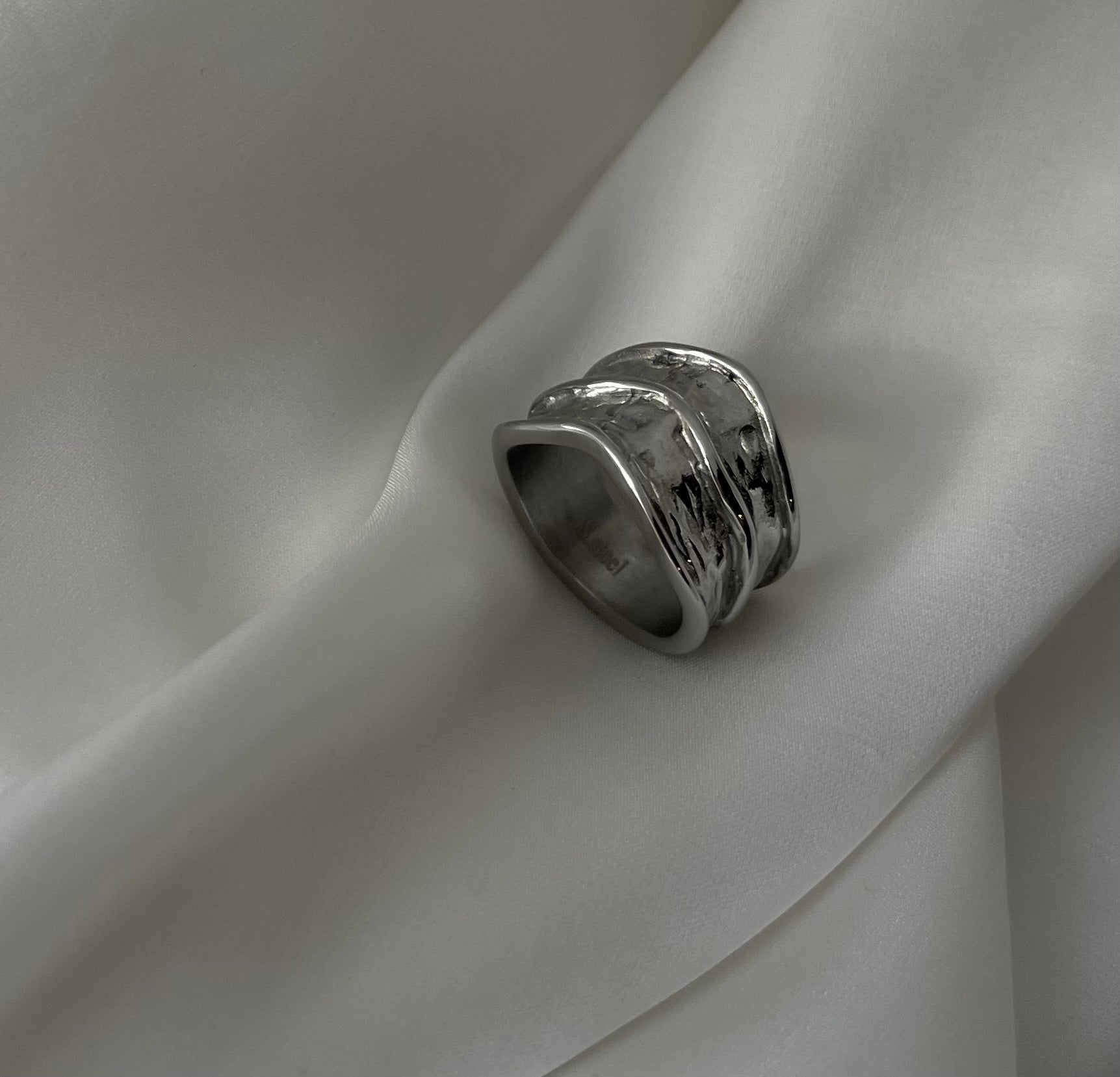 Anello fascia larga Designe ondulato , leggermente bugnato. Raffinato e Stiloso , un anello dall’ impatto Elegante ma giornaliero allo stesso tempo.