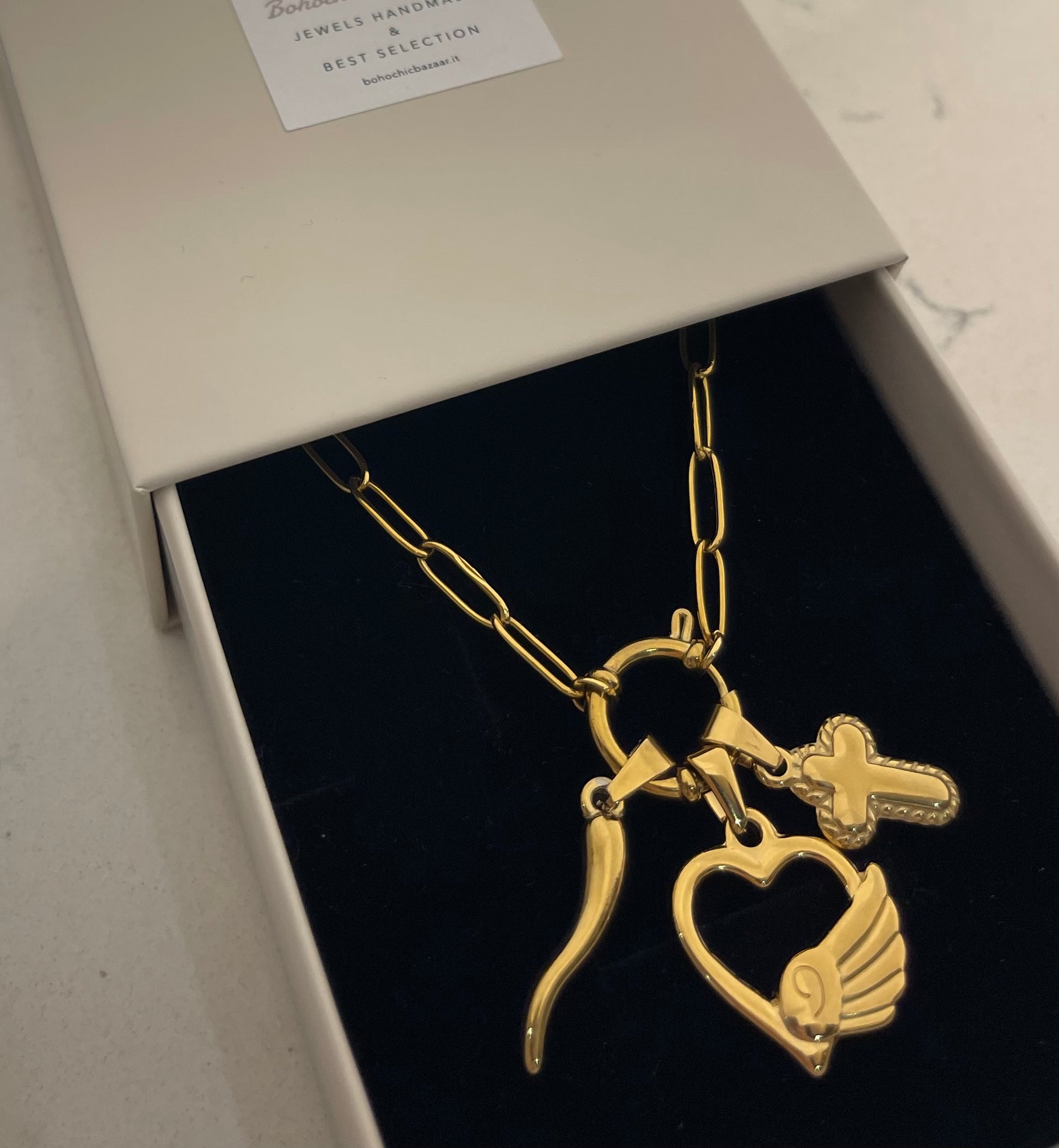 Collana Baguette Multicharms con chiusura a timone sul davanti , composta da tre ciondoli : corno Portafortuna, crocetta Bold , Amuleto cuore Ala