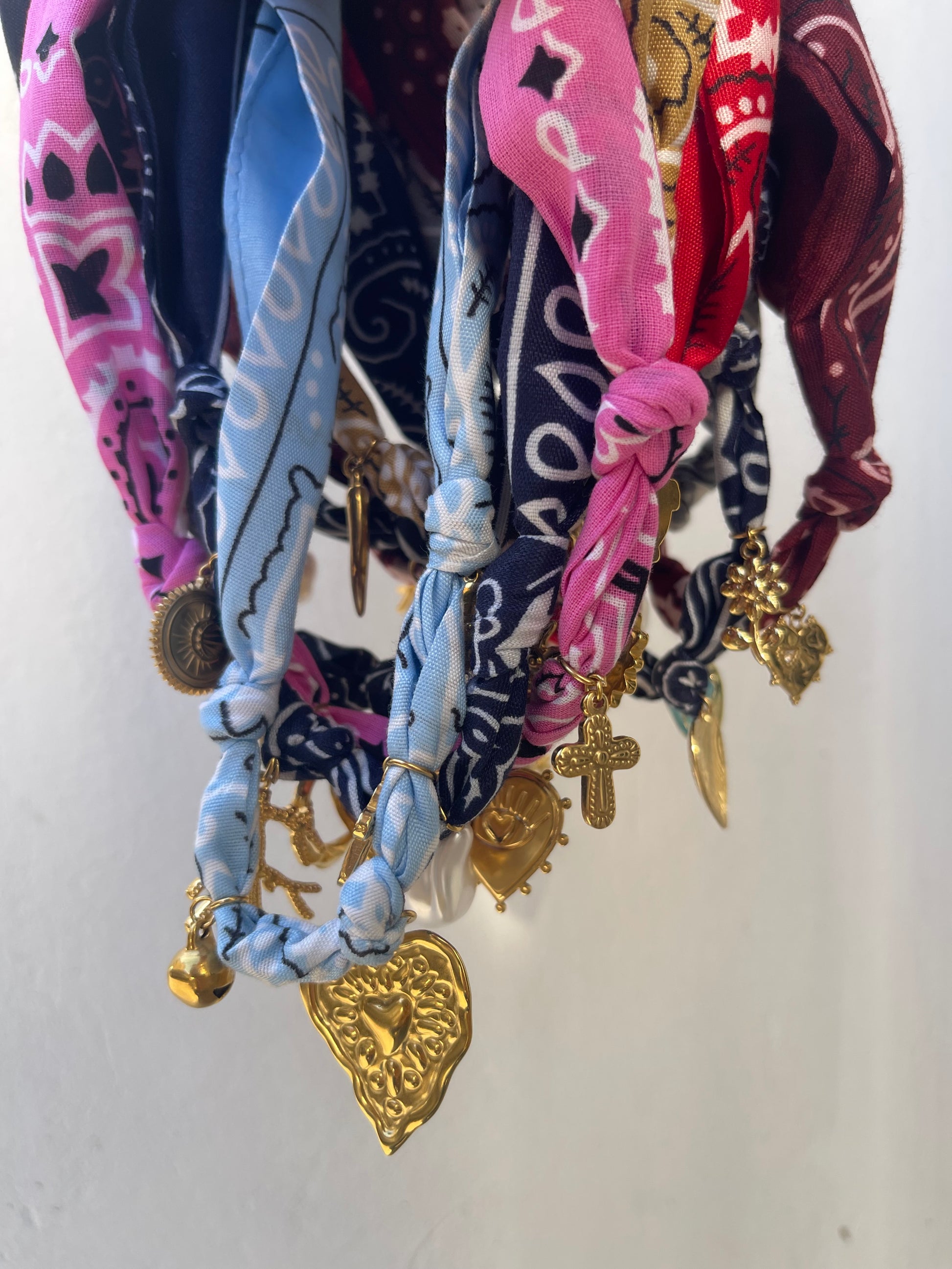 Collana realizzata a mano con tessuto Bandana , chiusura con moschettone. Impreziosita da tre ciondoli.