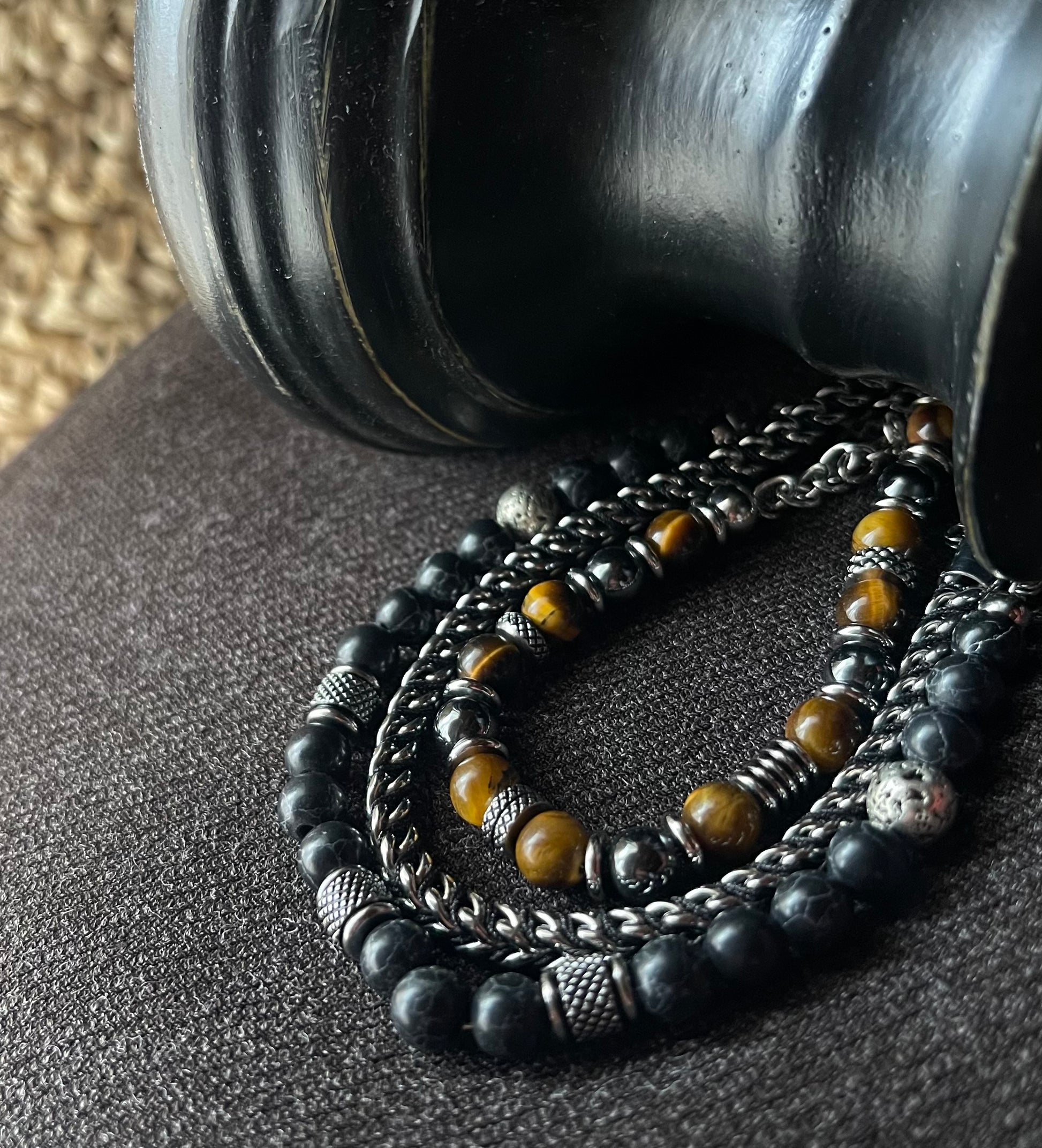 Bracciale sfere nere e dettagli in Acciaio. Chiusura moschettone e allungatura regolabile. Mixali insieme agli altri che trovi nel nostro sito !