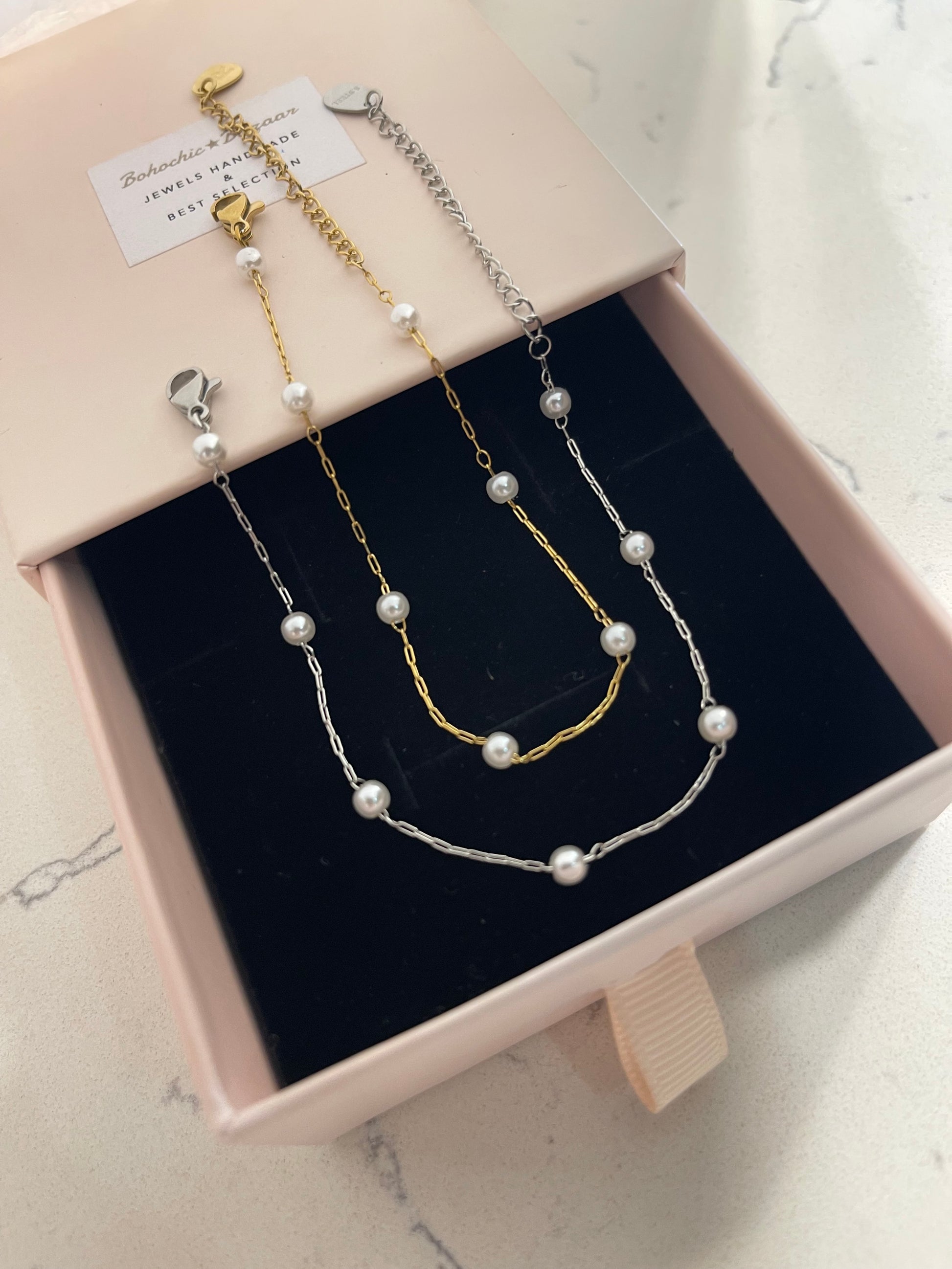 Bracciale catenina sottile con perle .Chiusura a moschettone e allungatura regolabile