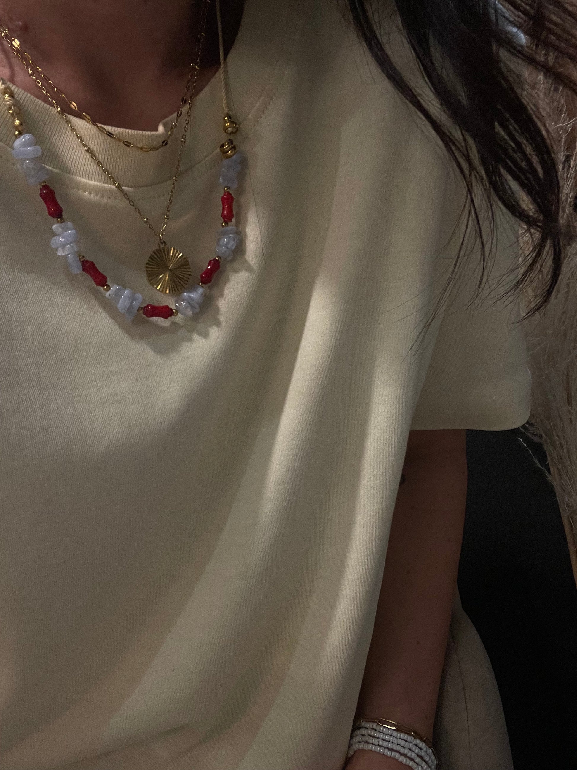 Collana cordino giallo burro con decoro di chips pietre dure e cilindri in corallo Bambù. Chiusura con moschettone .