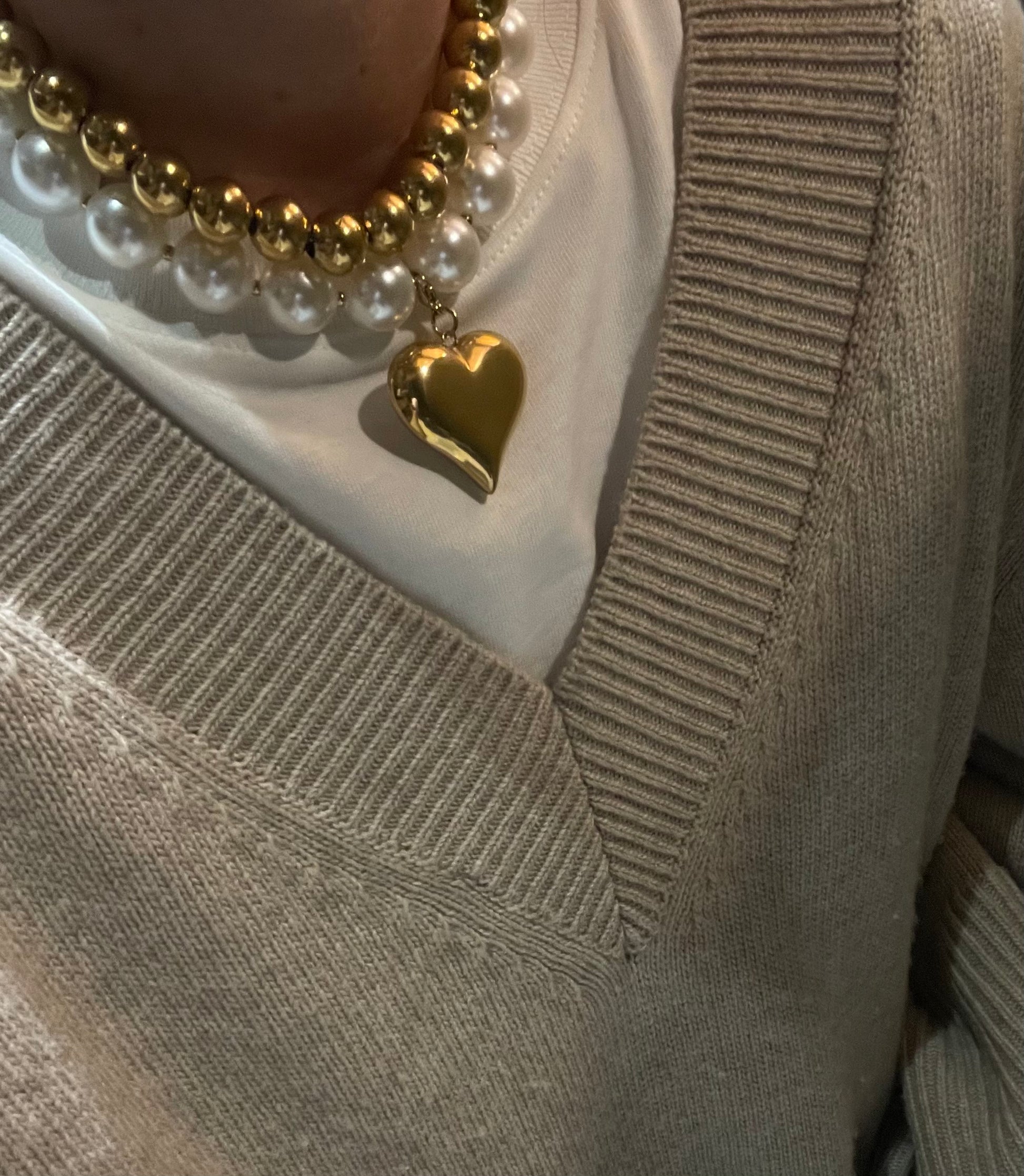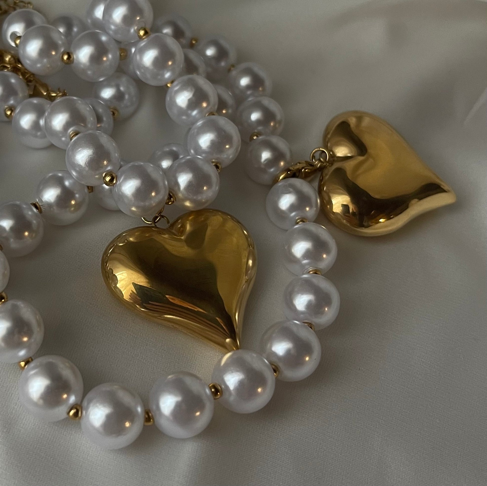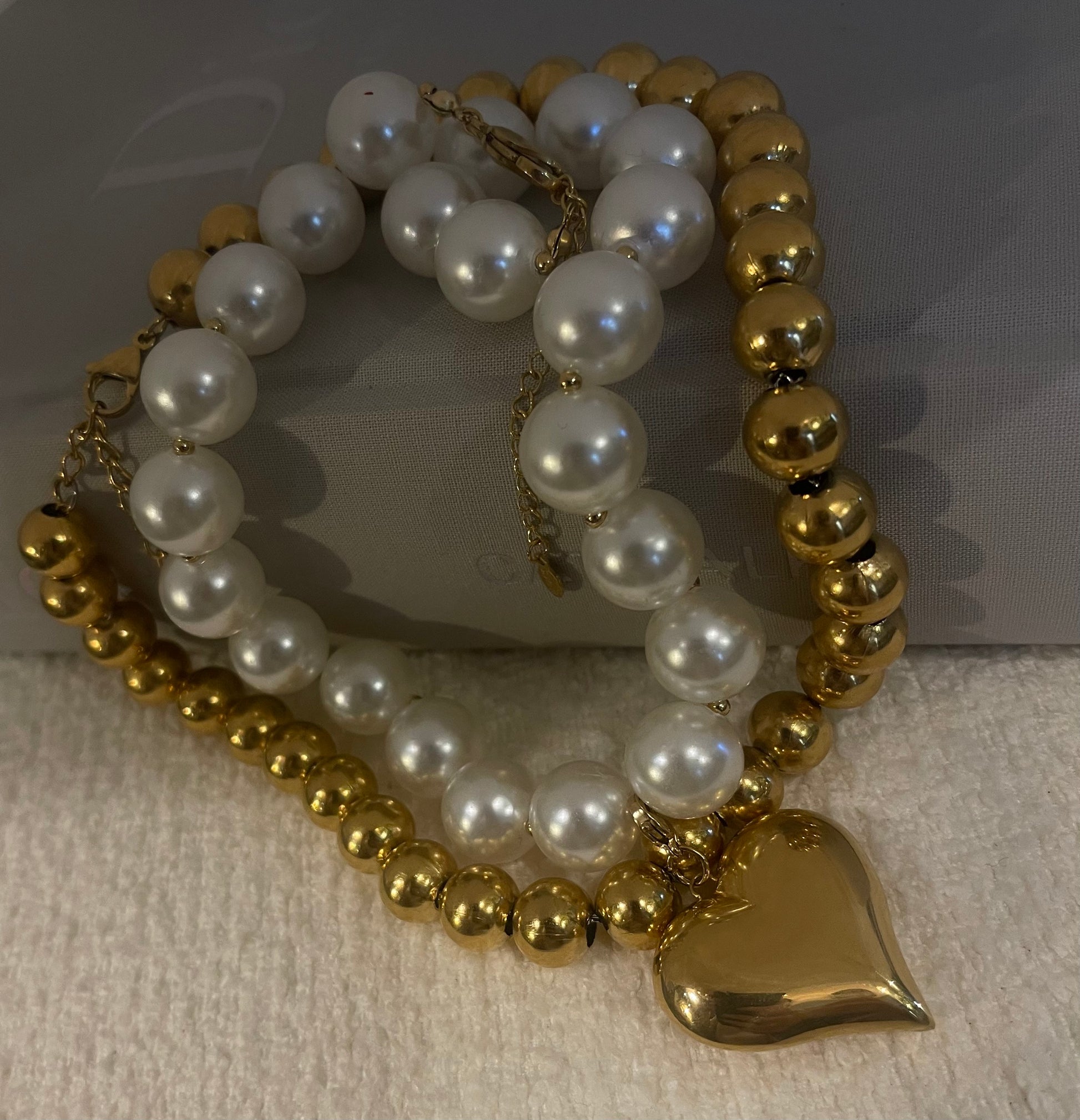 Collana di Perle grandi intervallate da mini sfere gold , con Ciondol Cuore grande bombato. Chiusura con moschettone allungatura regolabile.