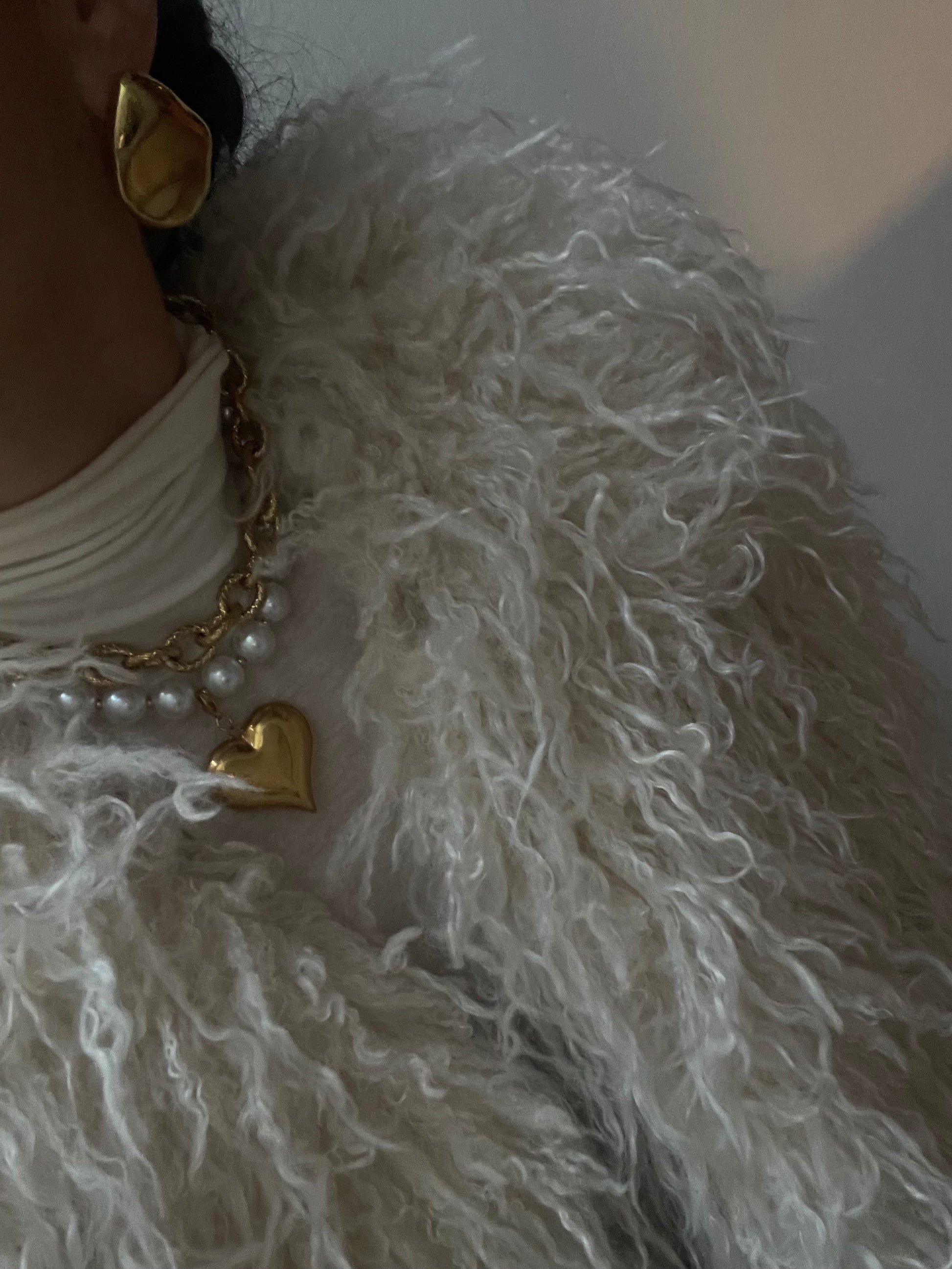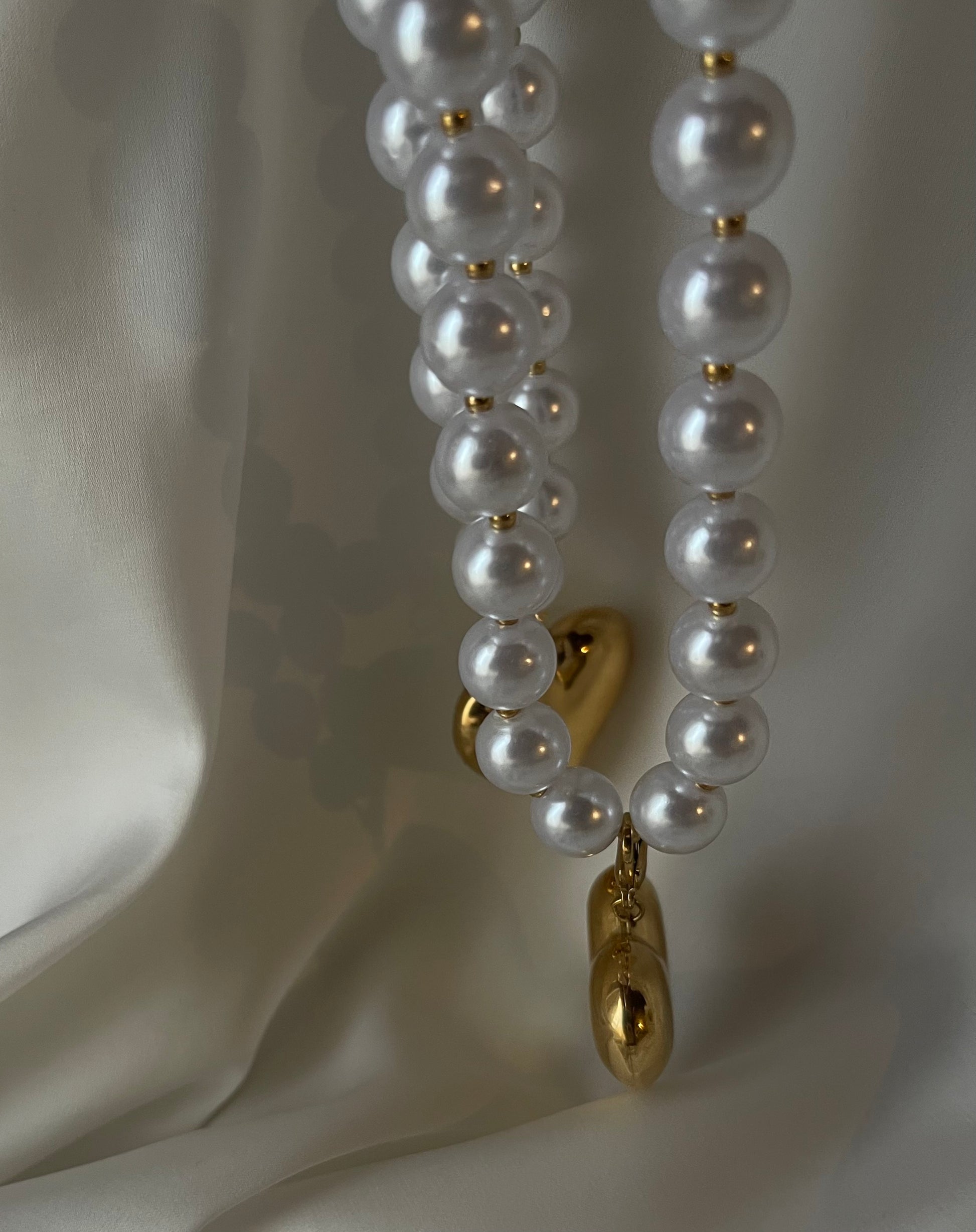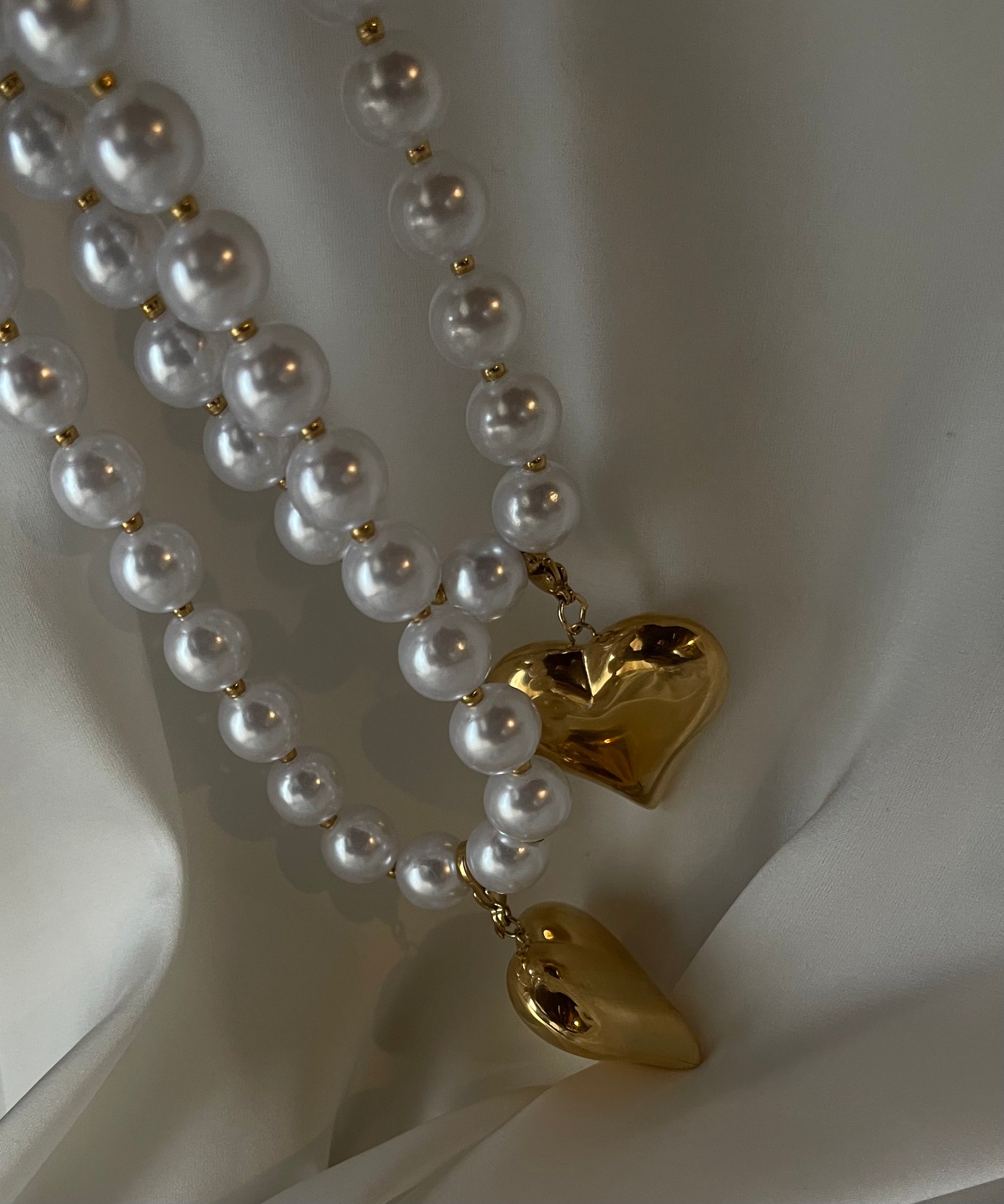 Collana di Perle grandi intervallate da mini sfere gold , con Ciondol Cuore grande bombato. Chiusura con moschettone allungatura regolabile.