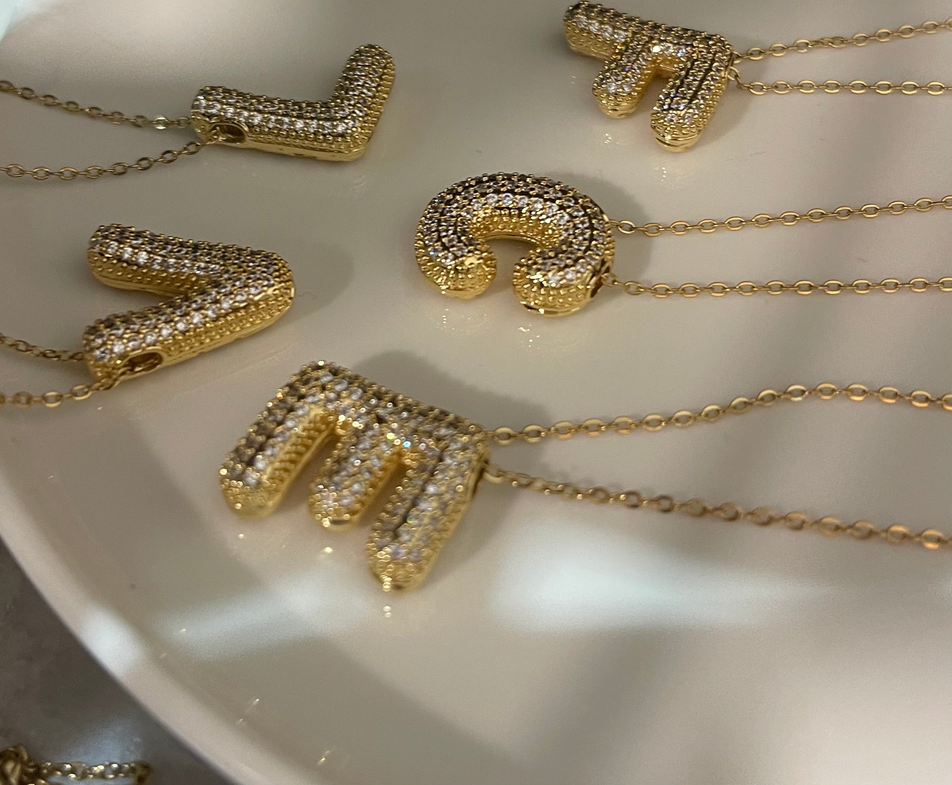 Collana con iniziale bombata Glimmering infilata.Zirconata pavè. var. GOLD . Collana in Acciaio come tutta l intera collezione che trovi nel nostro sito, Lettera in Ottond HighQuality placcato Oro .