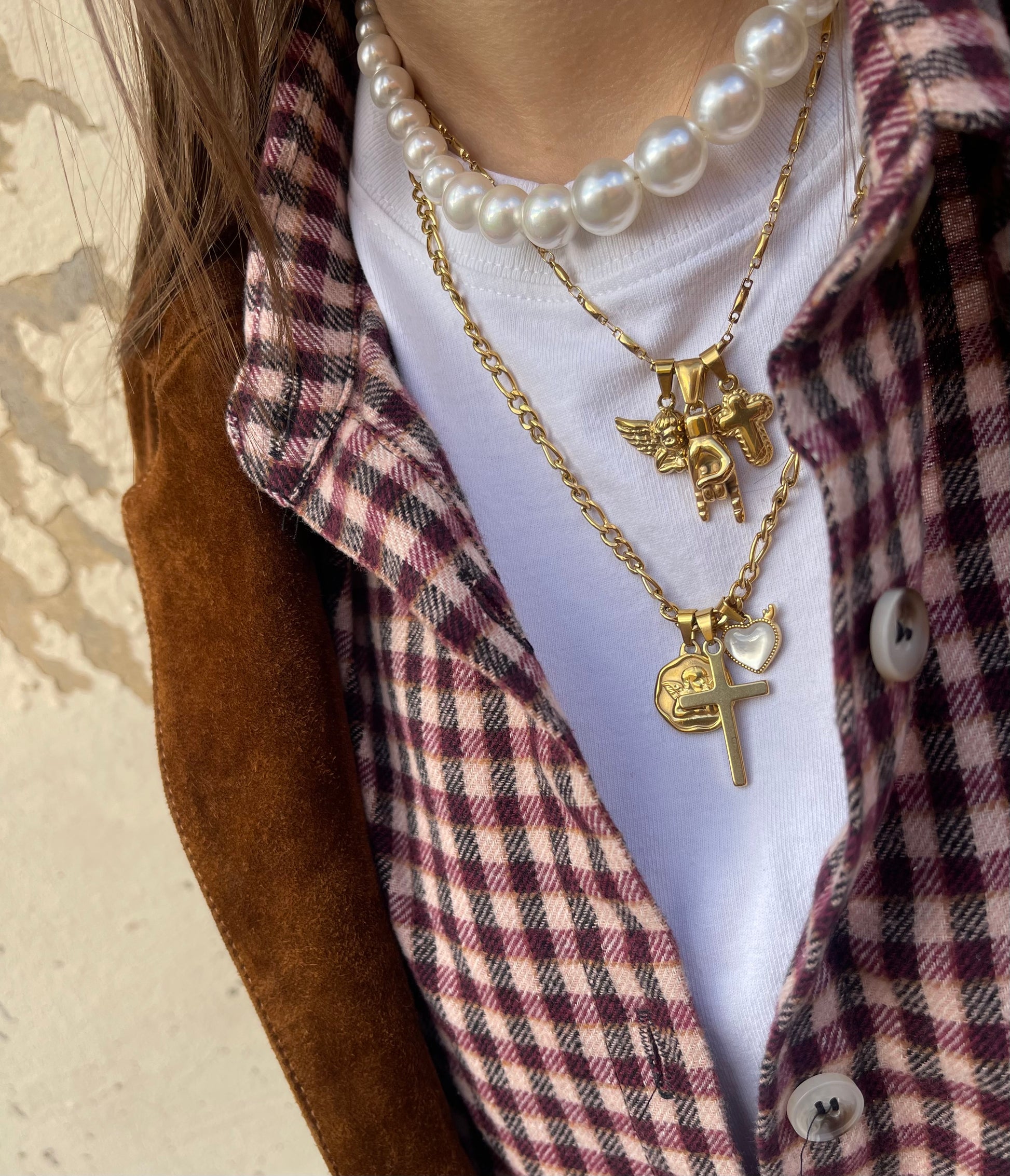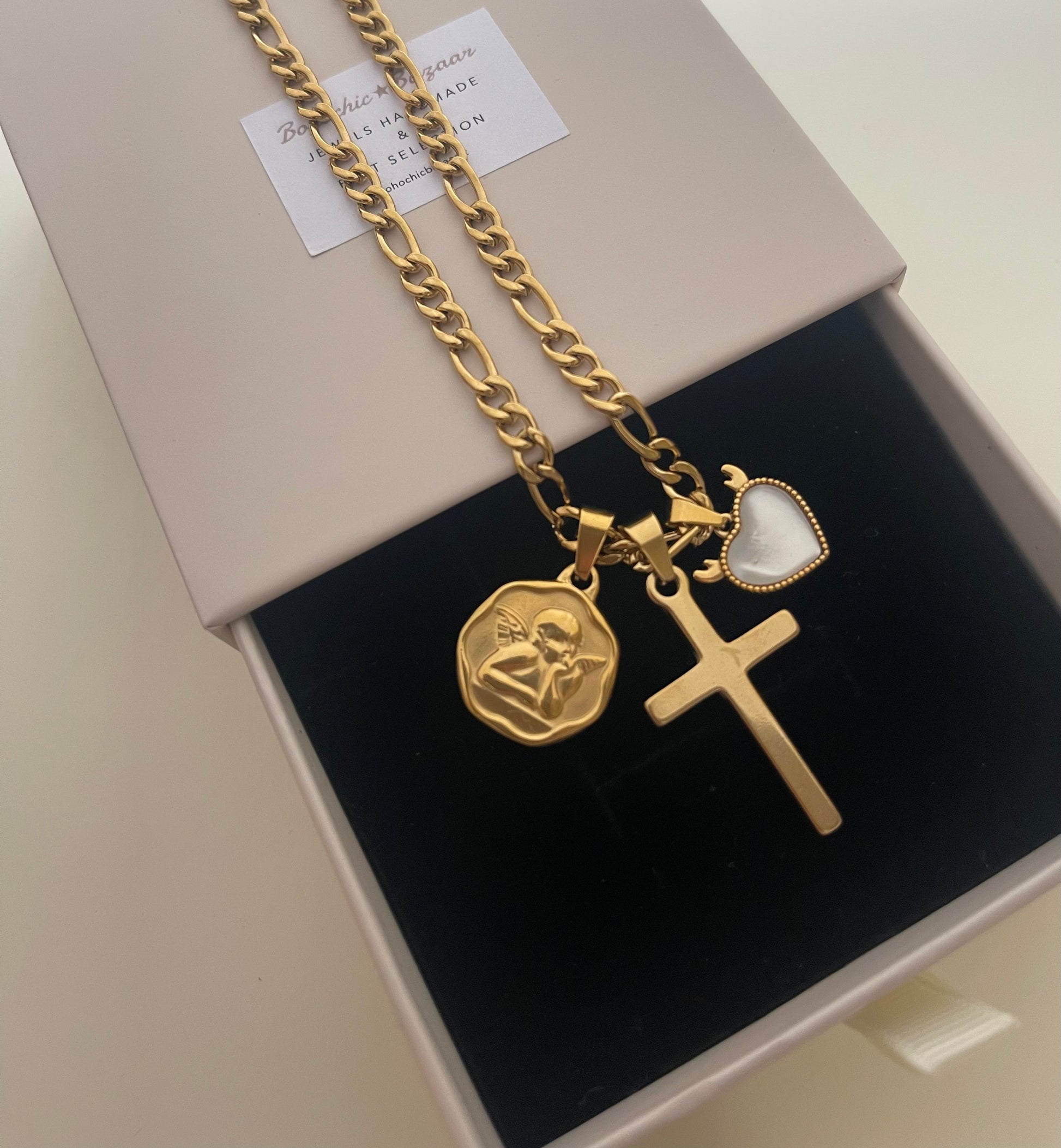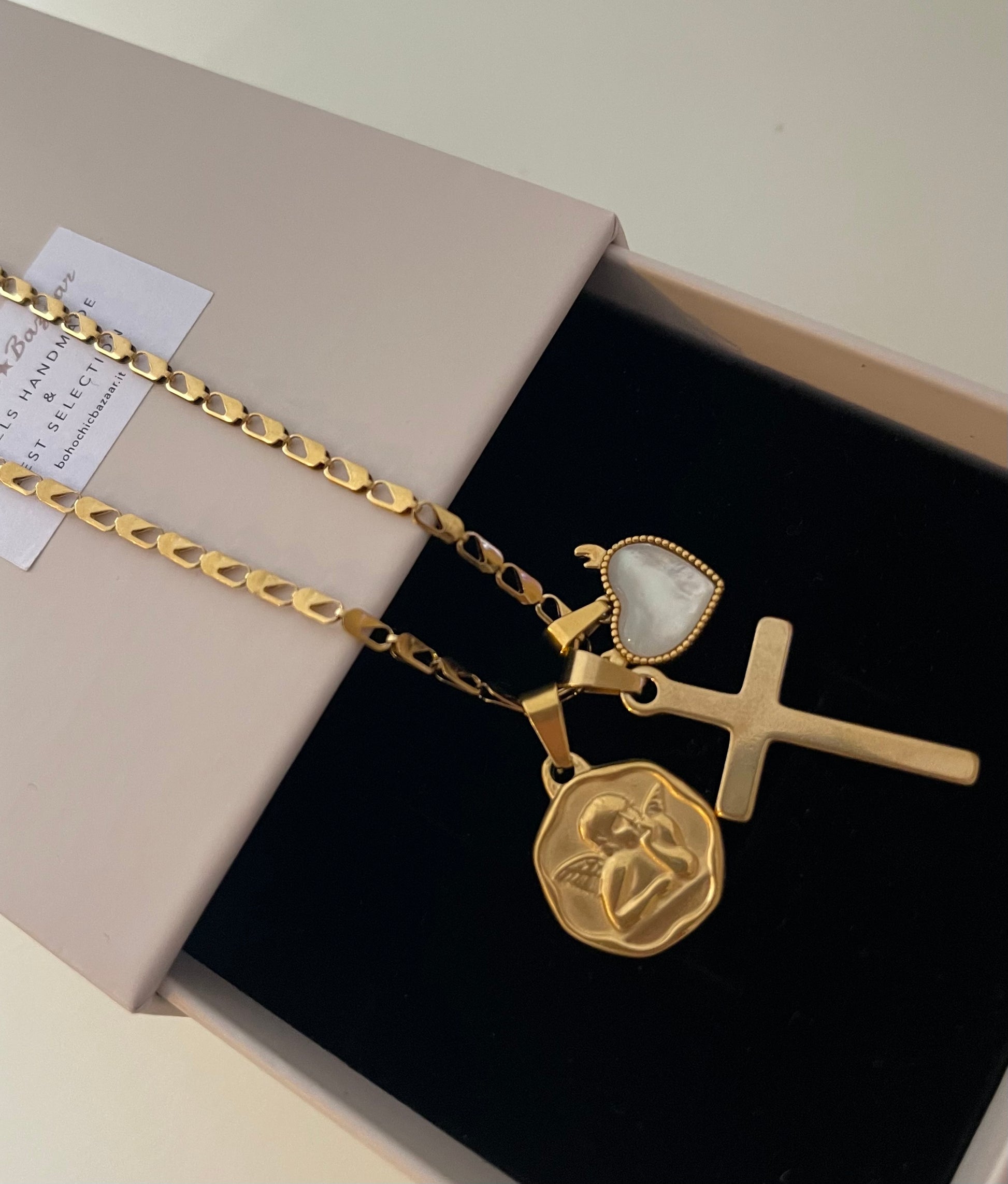 Collana Multicharms ✨Medaglia Angioletto, cuore madreperla e croce.satinata . Disponibile in due varianti catena : Grumetta e segmentata