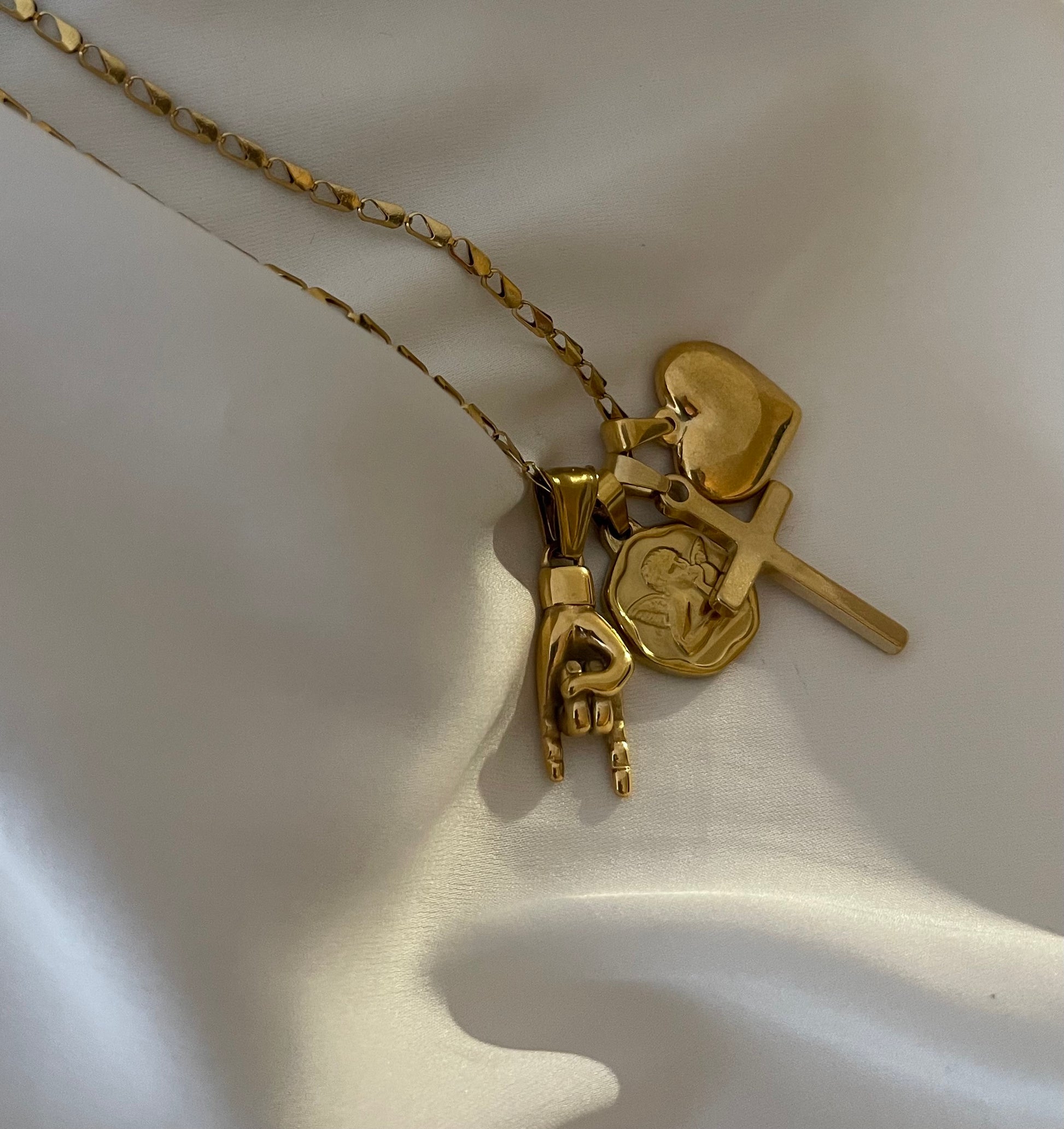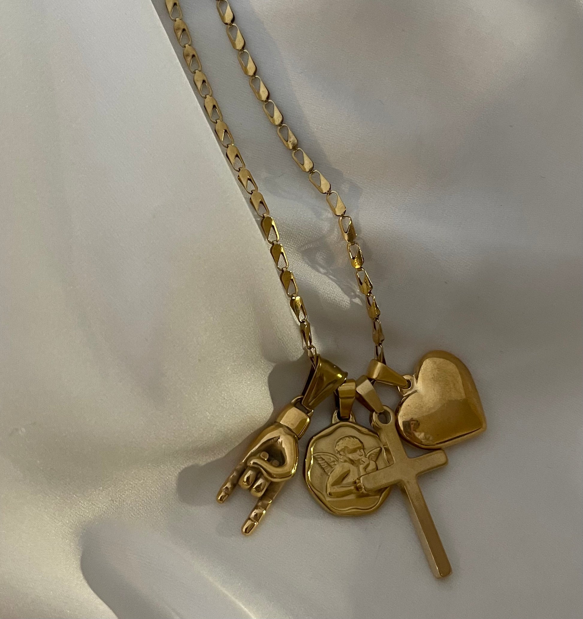 Collana Multicharms Trend . ✨, realizzata da noi con la nostra speciale selezione di Ciondoli .Catena speciale in stile Vintage , composta da quattro ciondoli: medaglia Giardian Angel, croce satinata , cuore piatto bombato e Corna