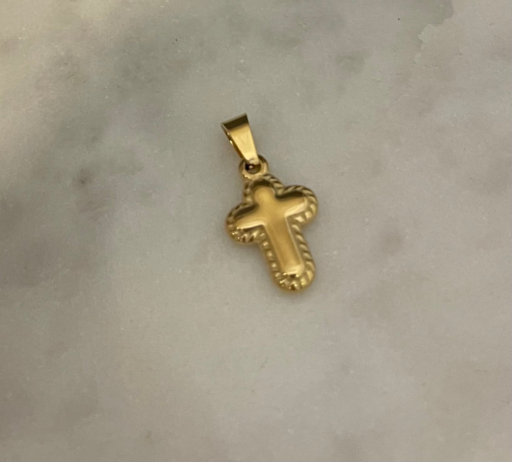 Ciondolo iconico di stile. Crocetta bombata liscia contornata lavorazione Torchon. Dimensione 1,8 cm