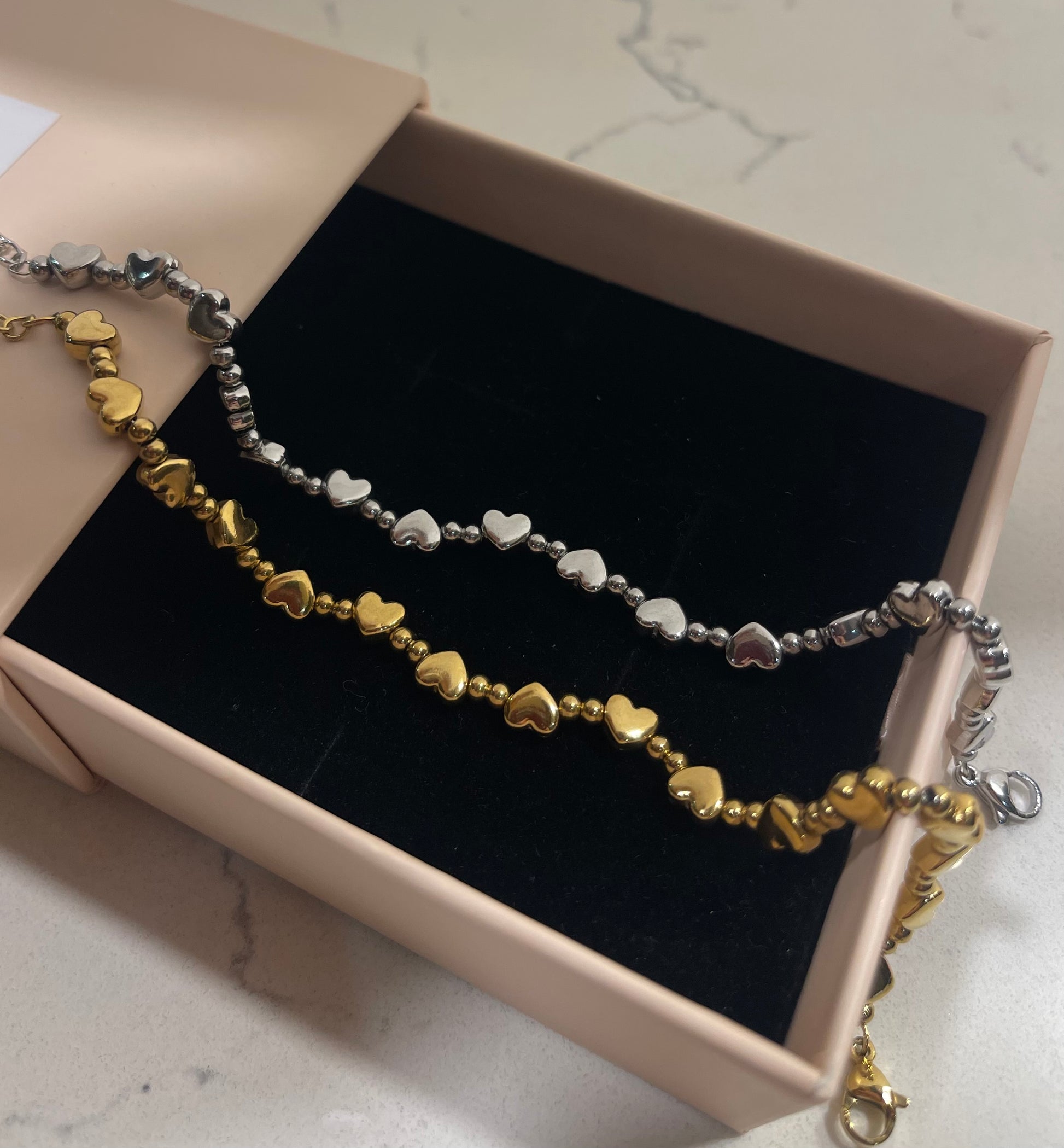 Bracciali Cuoricini bombati e mini sfere. Chiusura con moschettone e allungatura regolabile