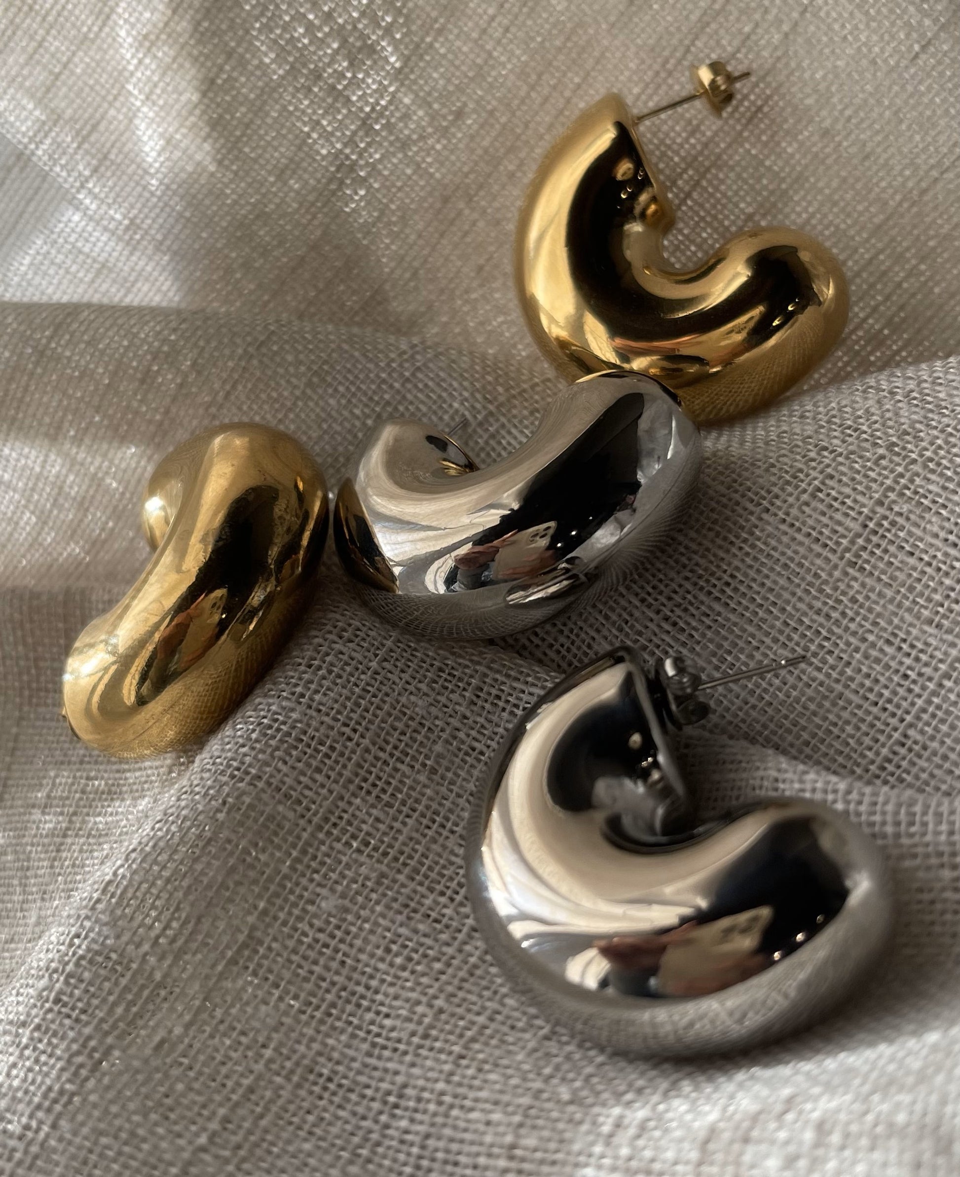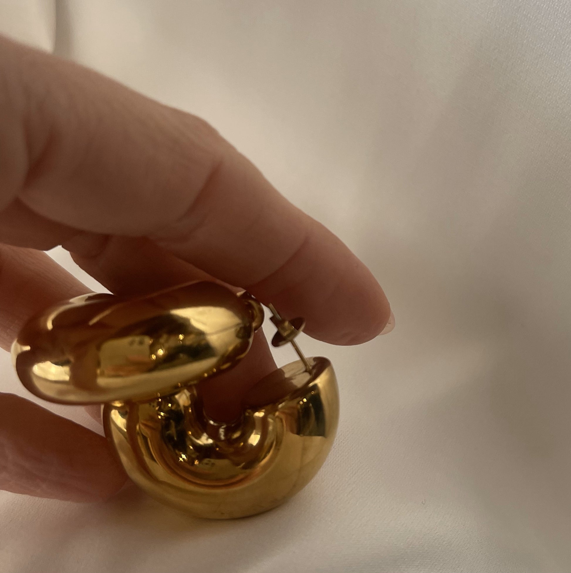 Orecchino semicerchio bombato tondeggiante. Super leggero, chiusura a perno.