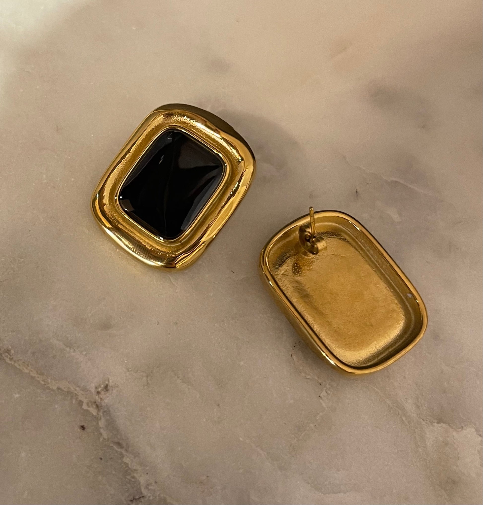 Orecchino a bottone must have trend Designe . Cornice dorata e interno in agata nera.