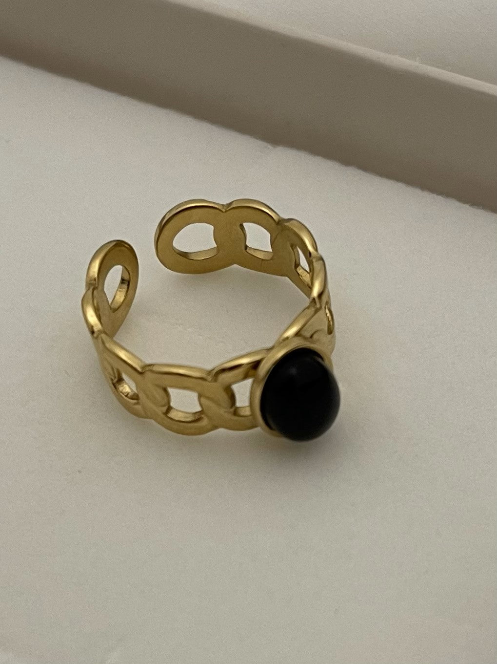 Anello a catena, maglia larga .Pietra nera centrale a forma ovale.