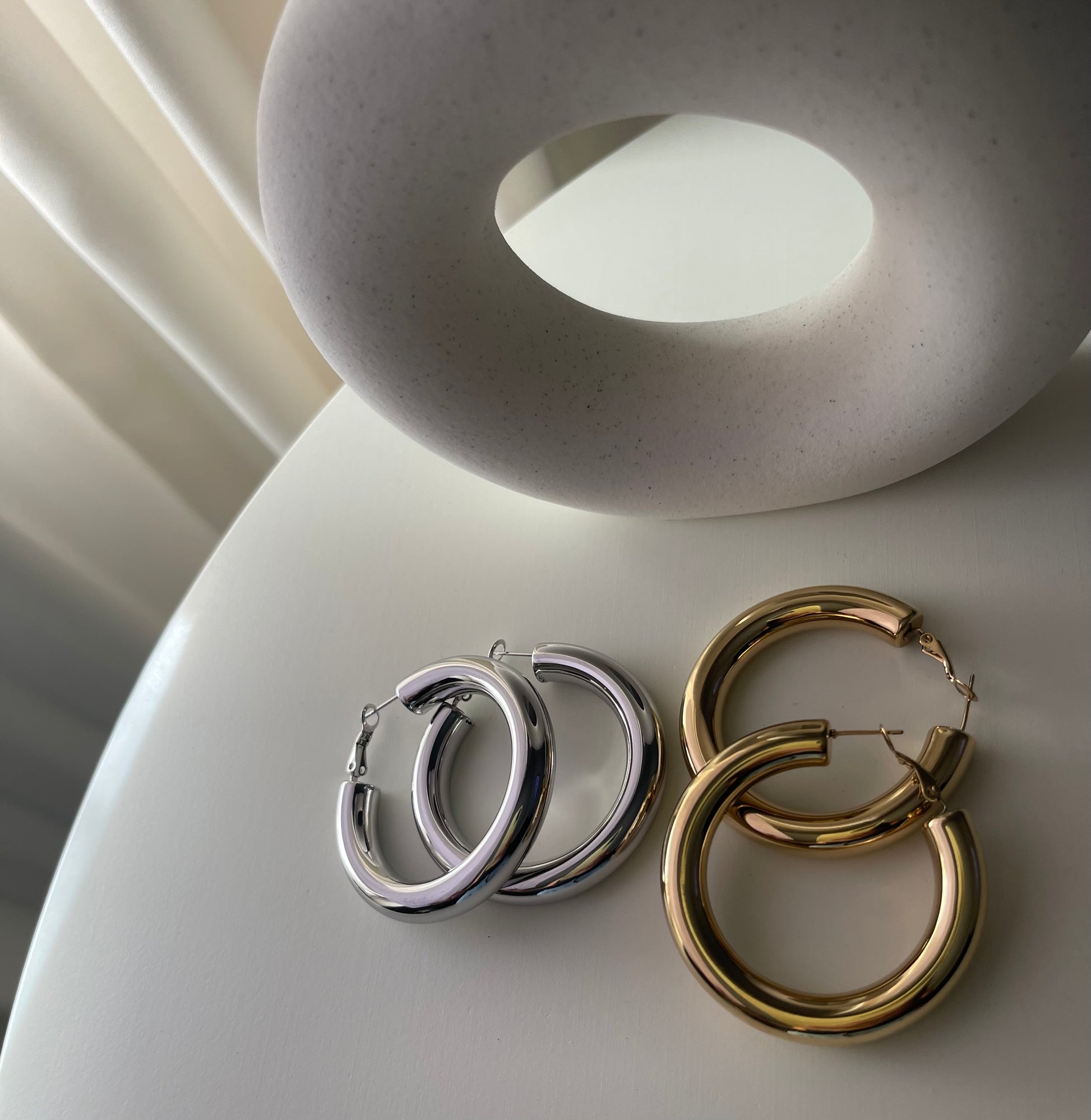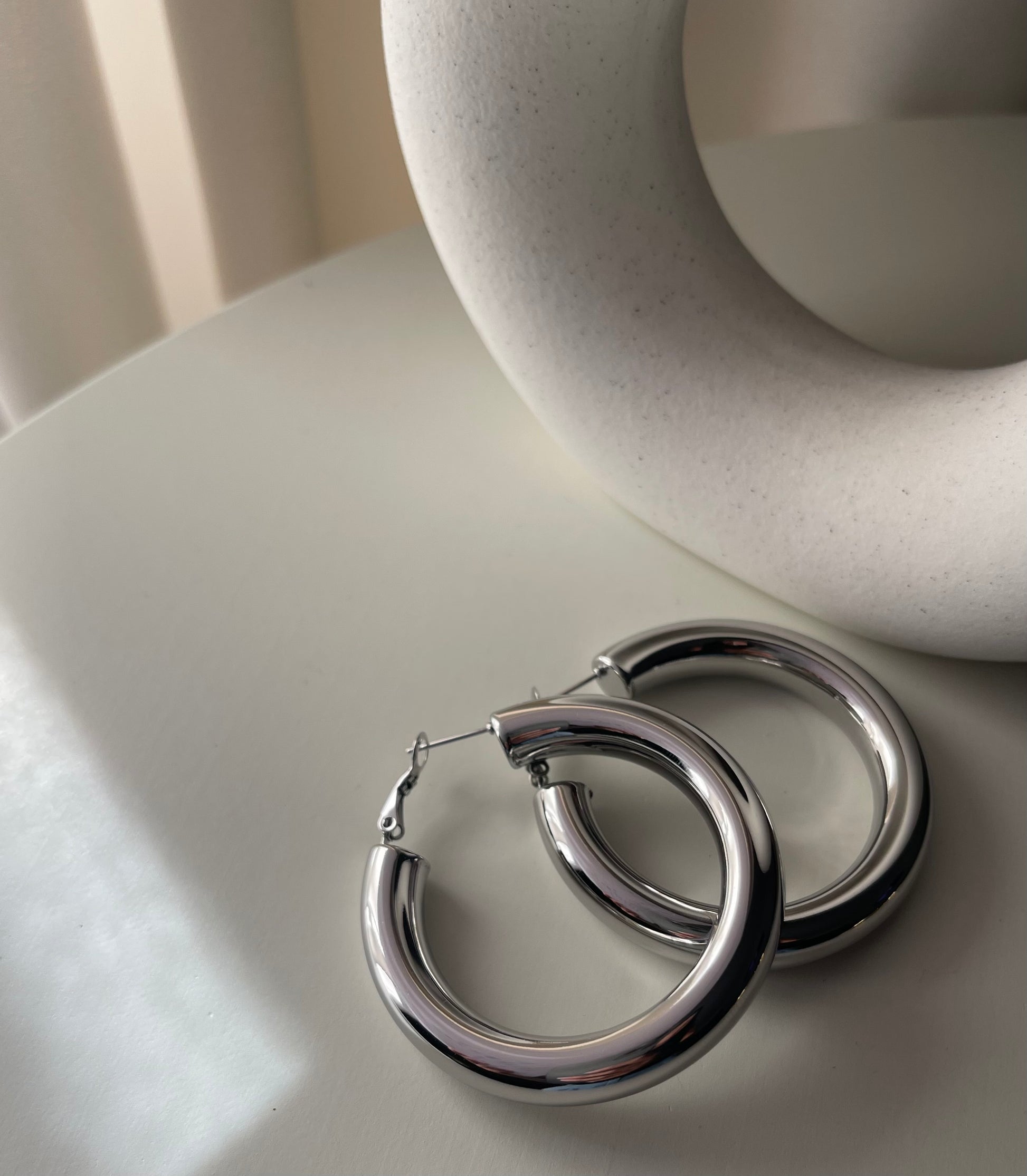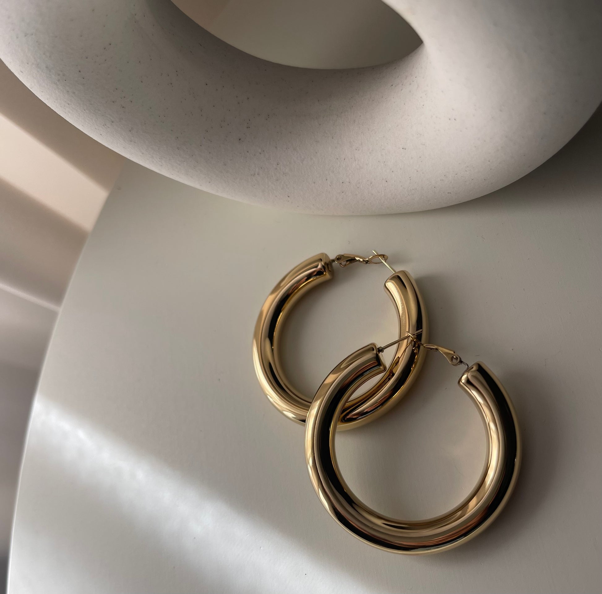 Orecchini a cerchio semibombati , Dimensione 50 mm , chiusura classica. Un passpartout da avere nel cassetto dei gioielli, super leggero e versatile per tanti vostri outfit