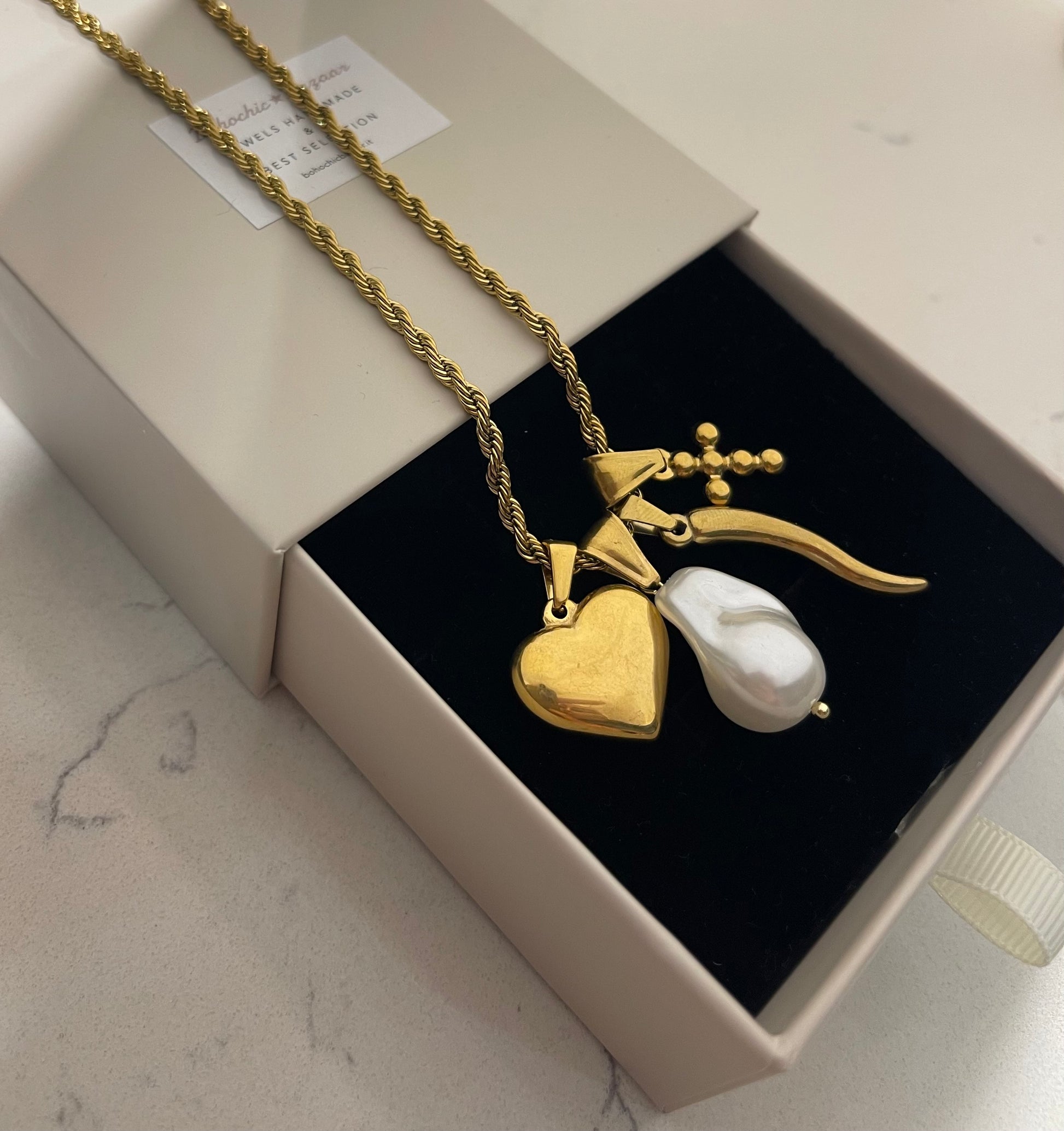 Collana Multicharms , Torchon .Composta da 4 ciondoli : cuore bombato , maxi corno portafortuna , Ciondolo perla e crocetta Bubble Bold