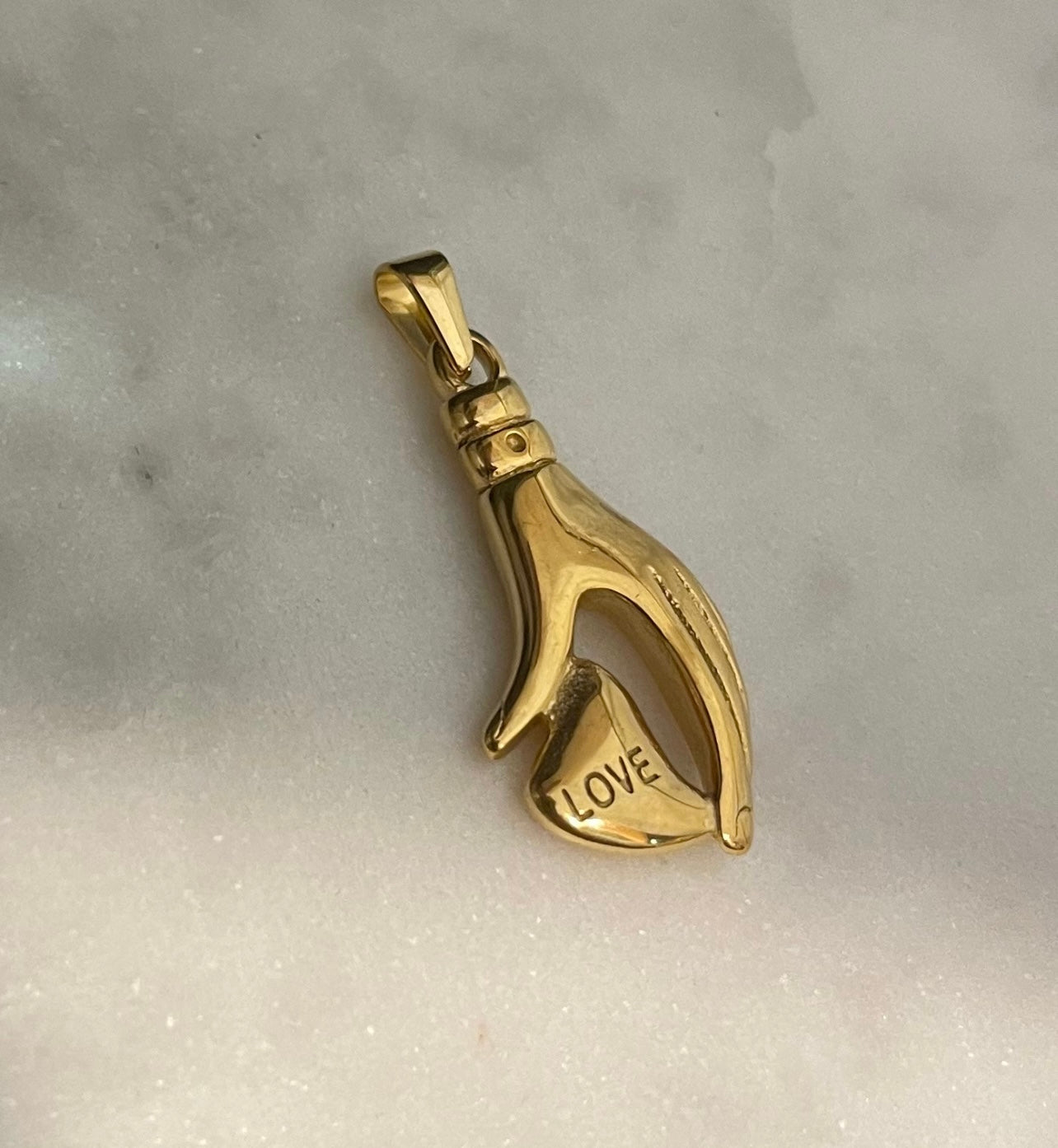 La mano che tiene il cuore. Simboleggia Amire, affetto , connessione profonda e fiducia. Dimensione 3 cm + gancio porta ciondolo