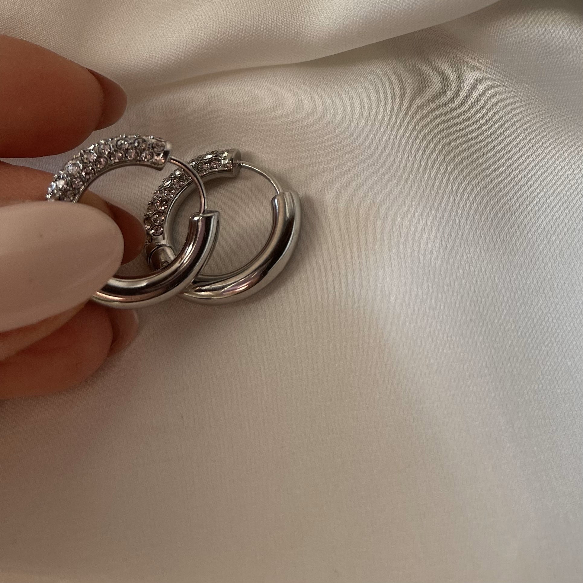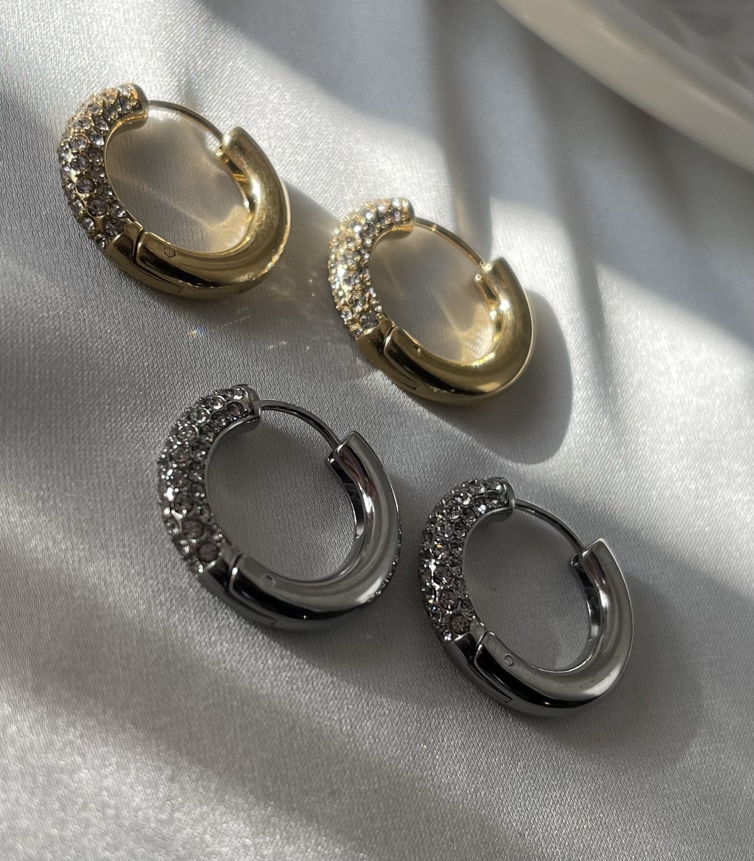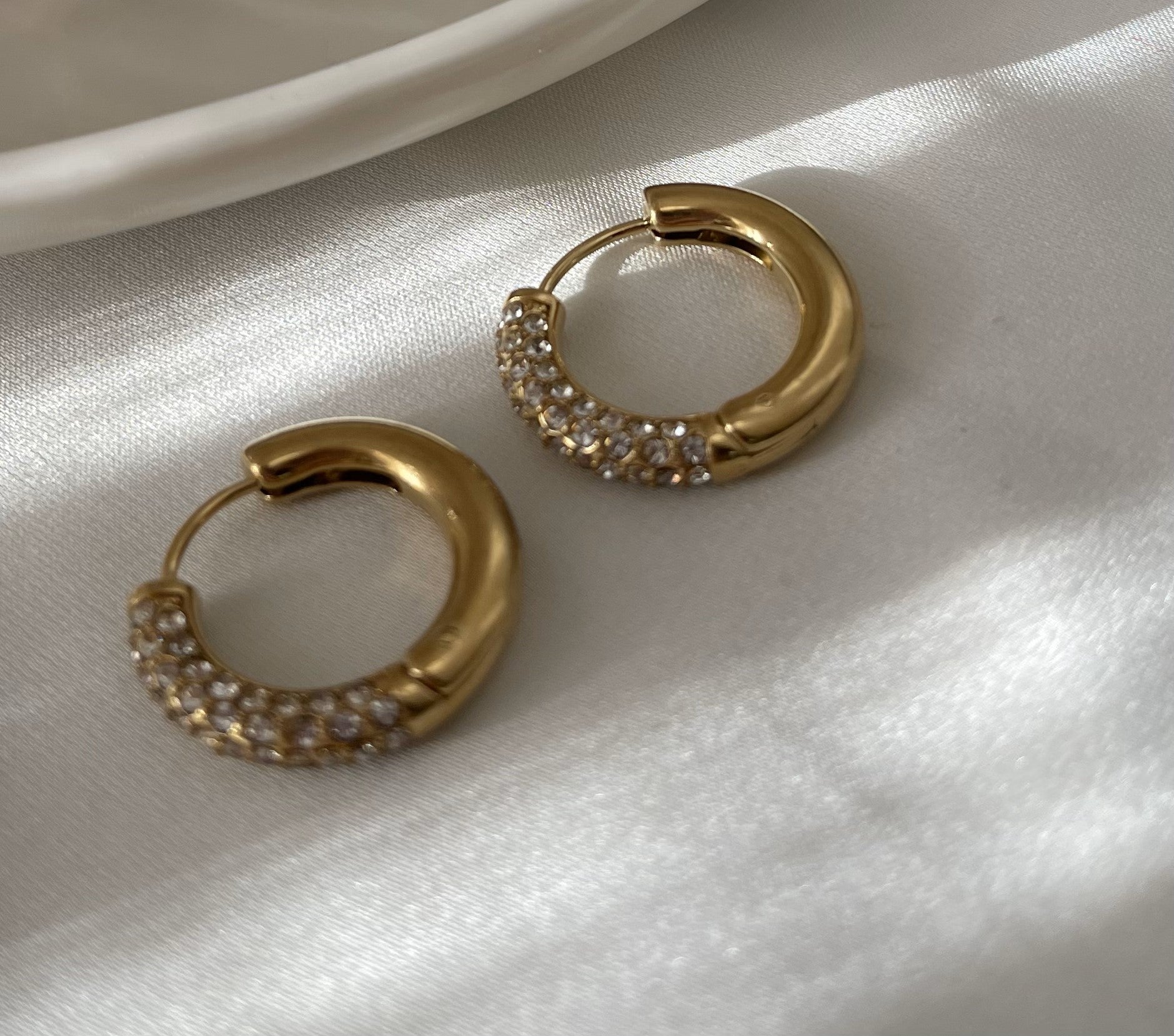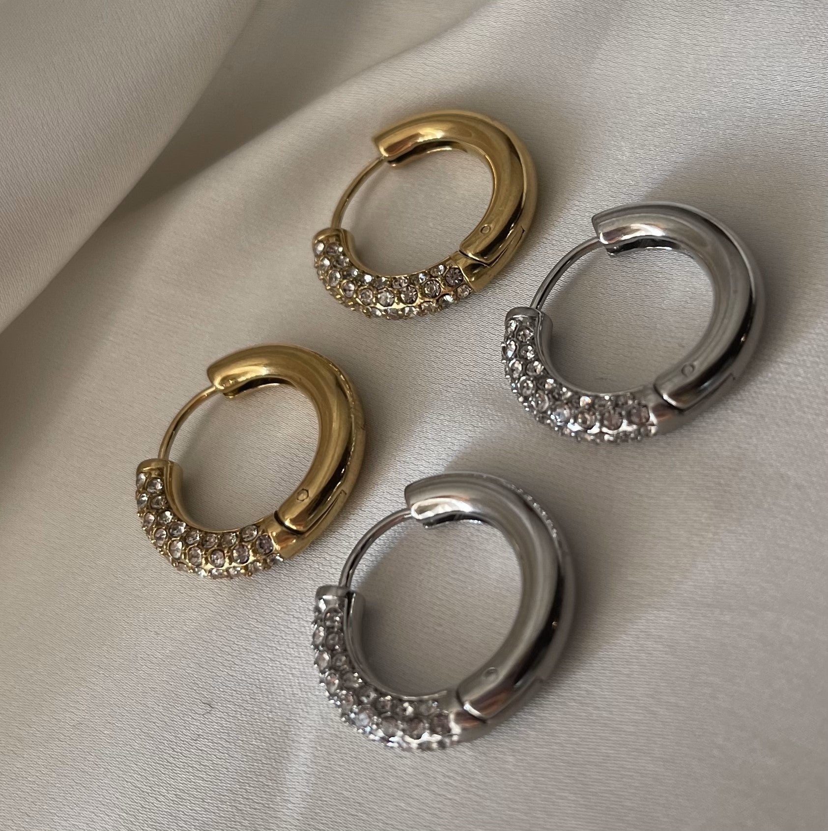 Hoops bombato zirconi incastonati, metà e metà. Chiusura a scatto.