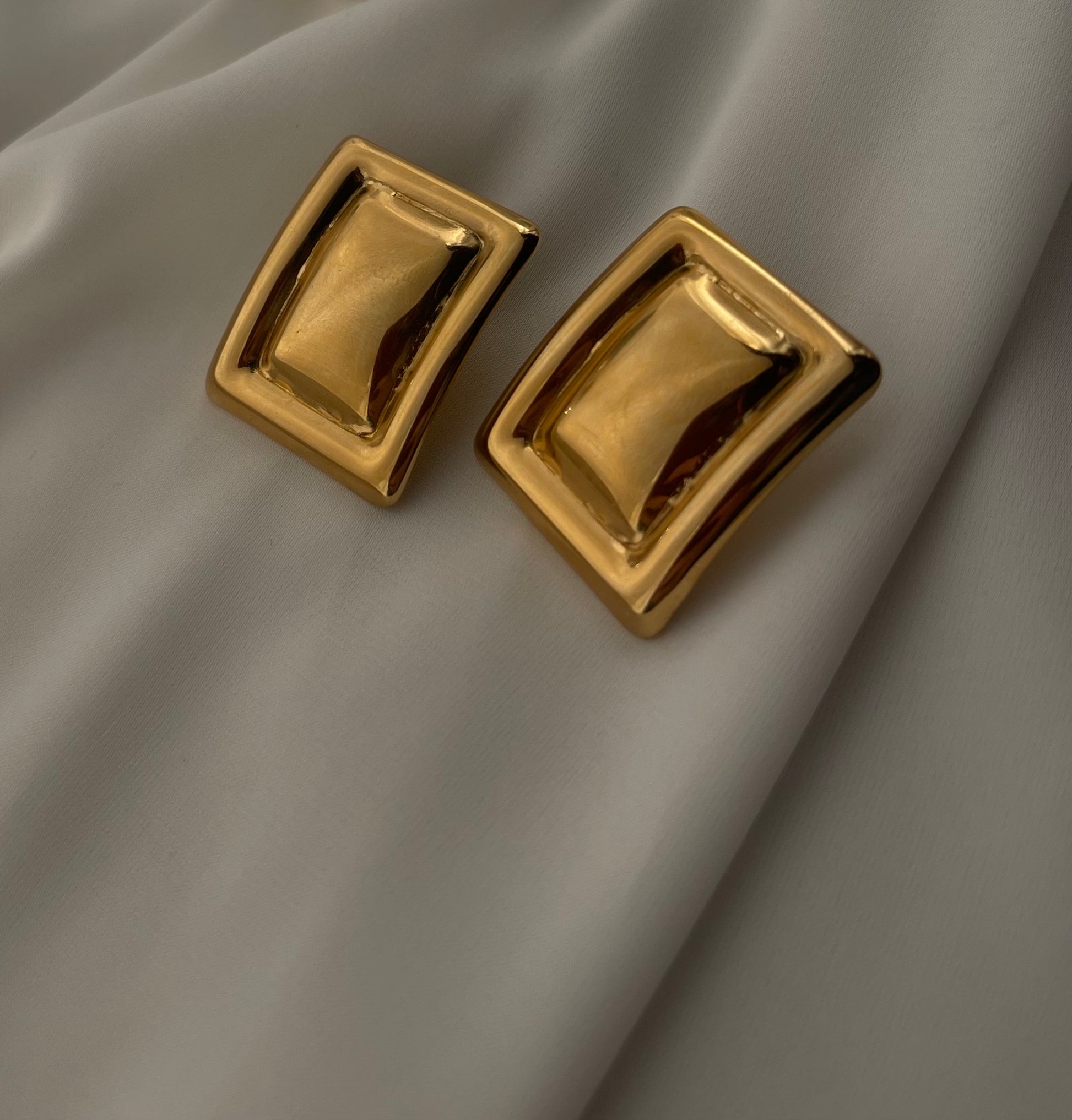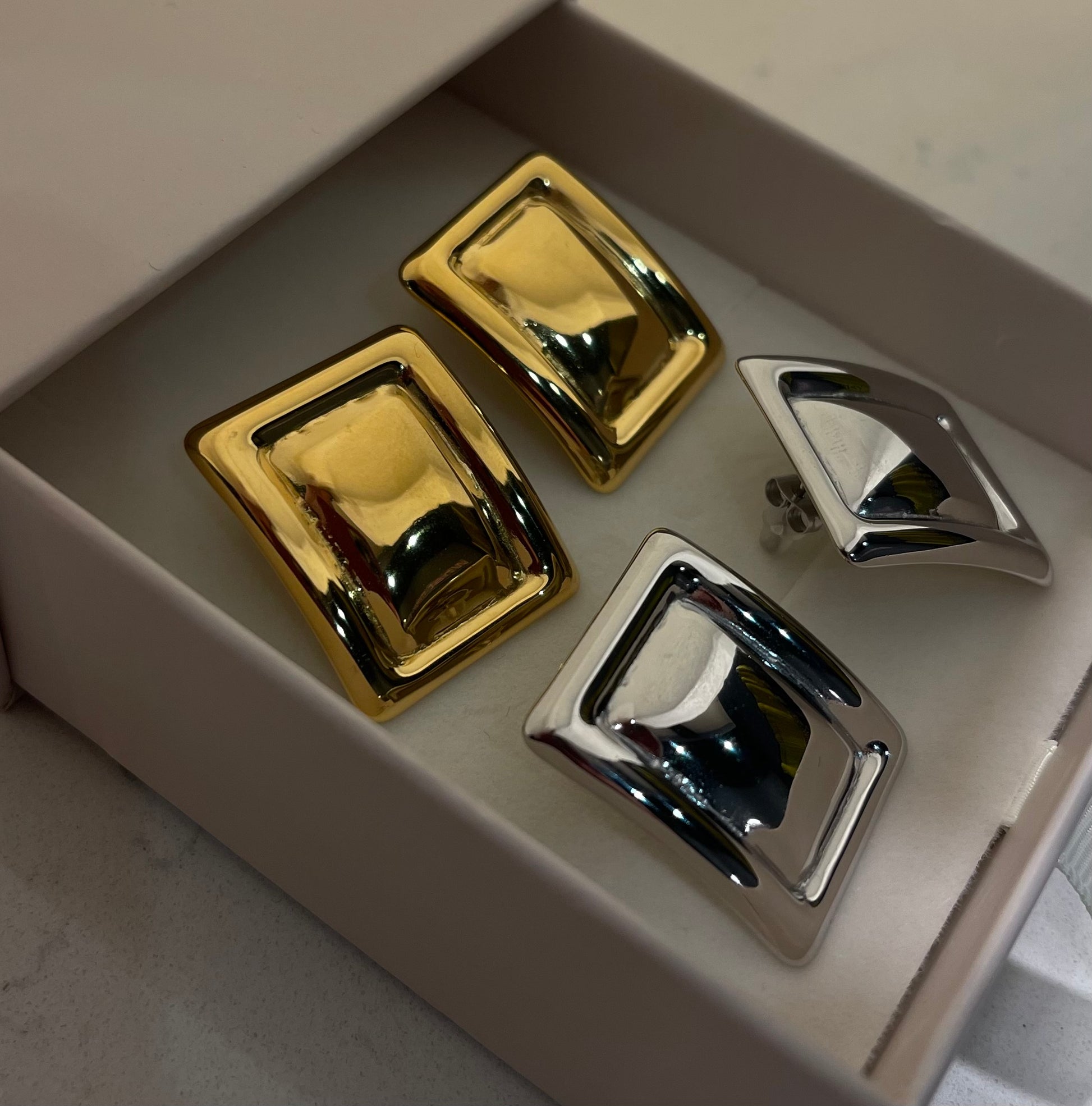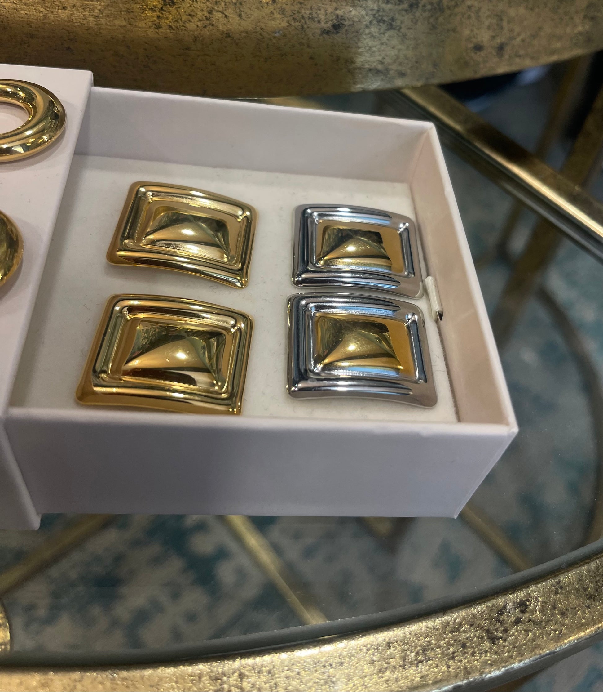 Orecchino a Bottone , rettangolo. Chiusura con perno e farfallina . Dimensione 3 cm x 2,5