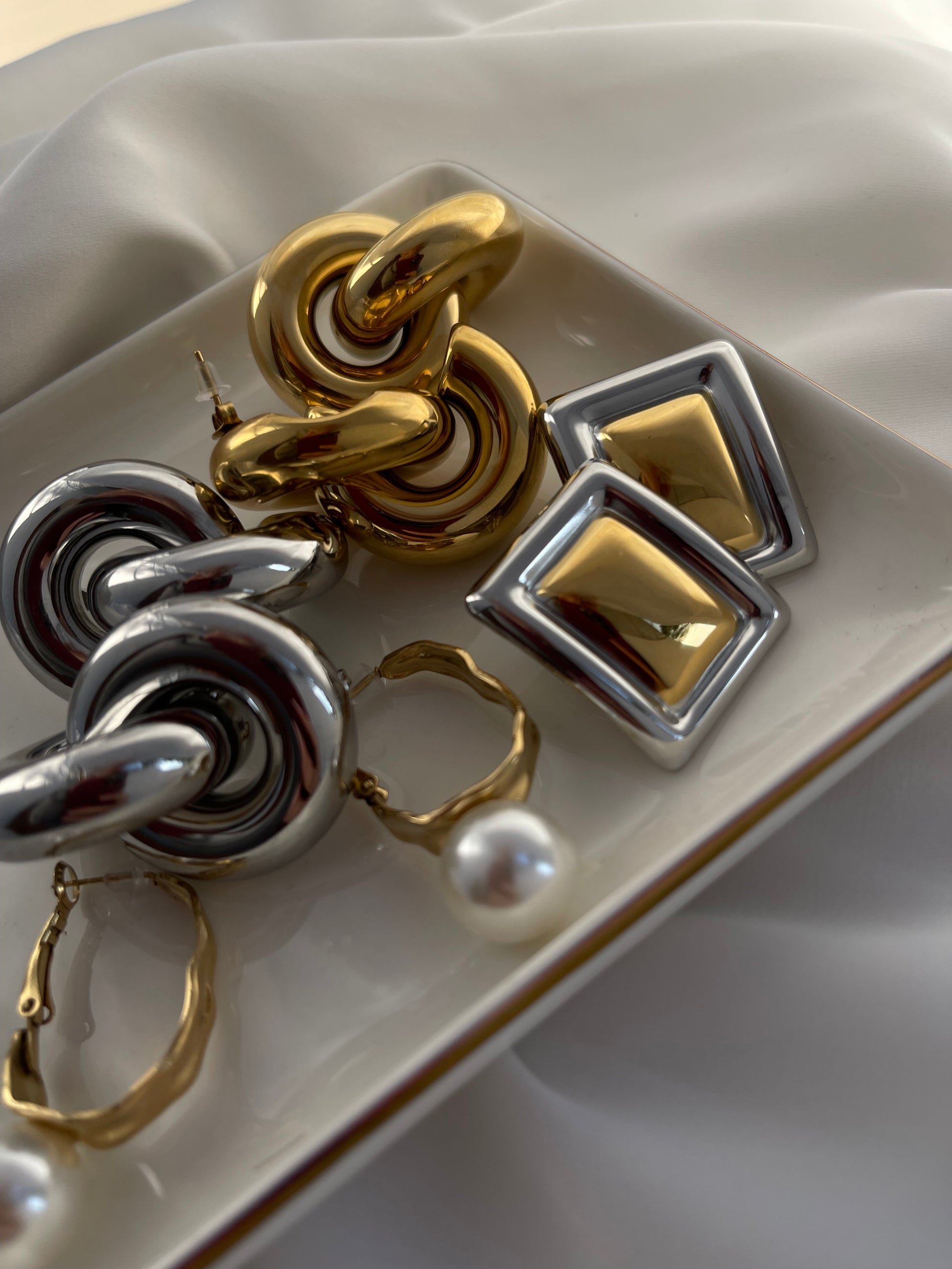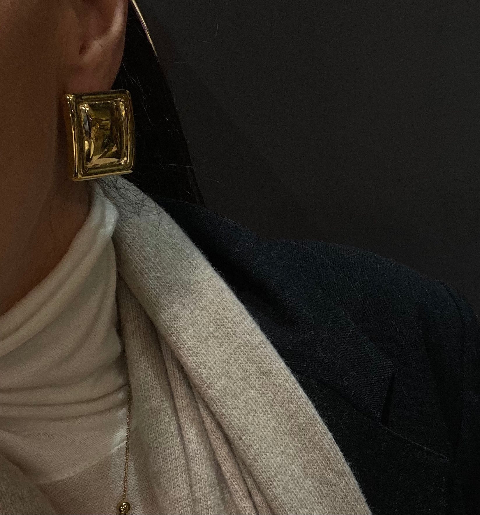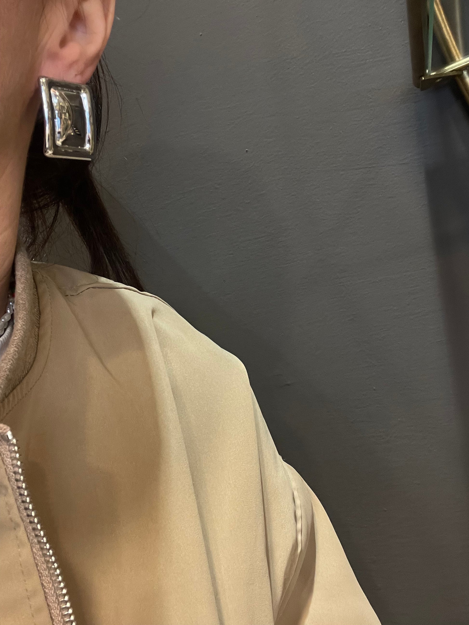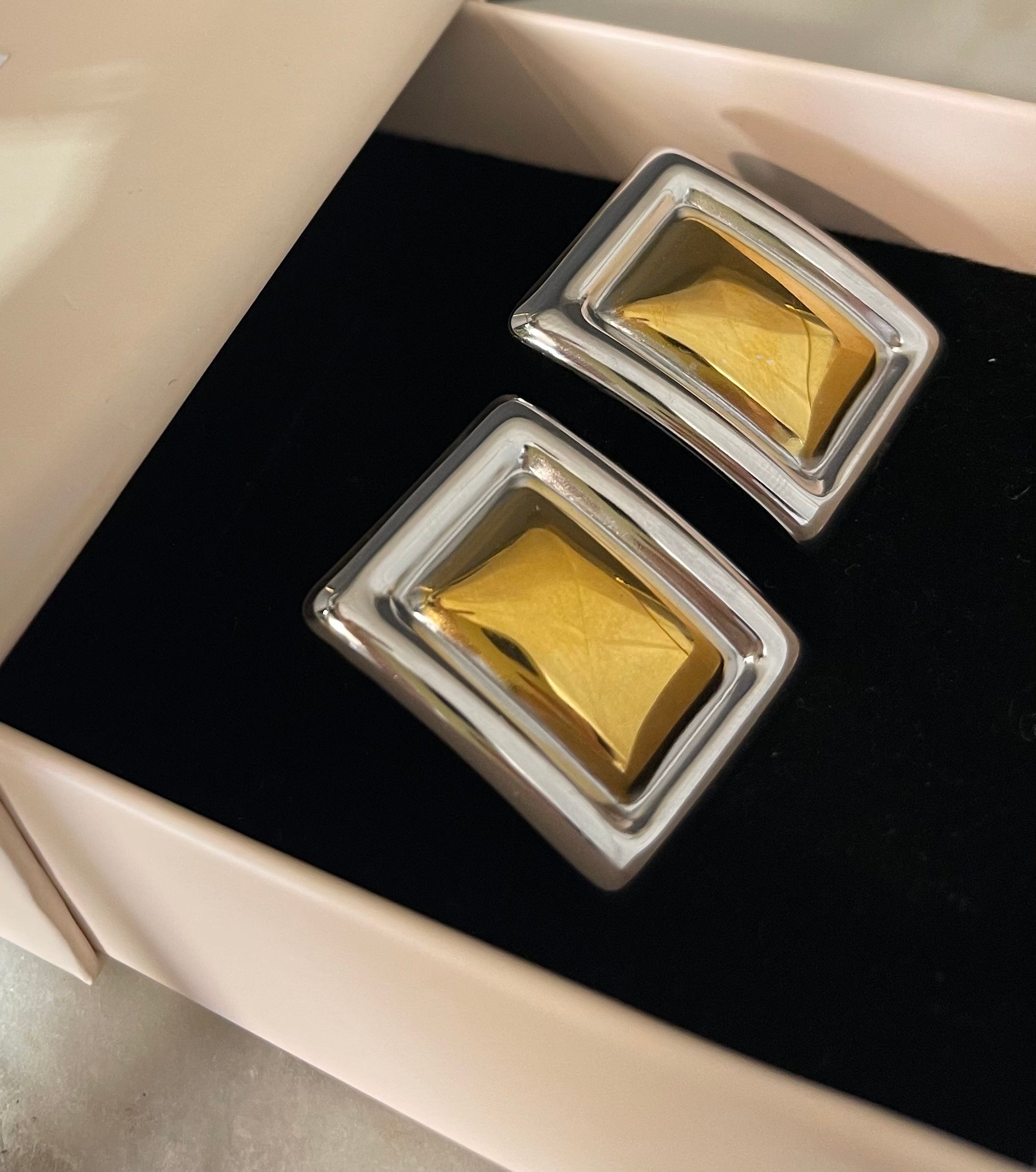 Orecchino a Bottone , rettangolo. Chiusura con perno e farfallina . Dimensione 3 cm x 2,5