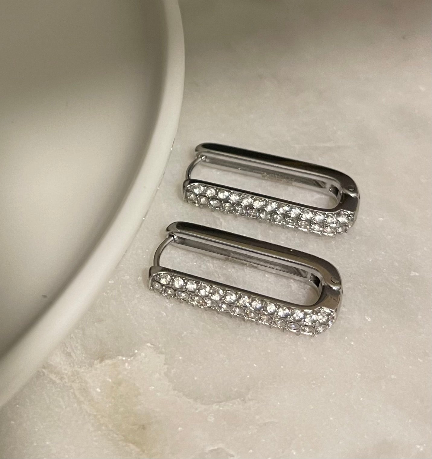Orecchino rettangolo, con angoli stondati. Parte davanti con Zirconcini crystal incastonati. Chiusura a scatto. Dimensione 25 mm