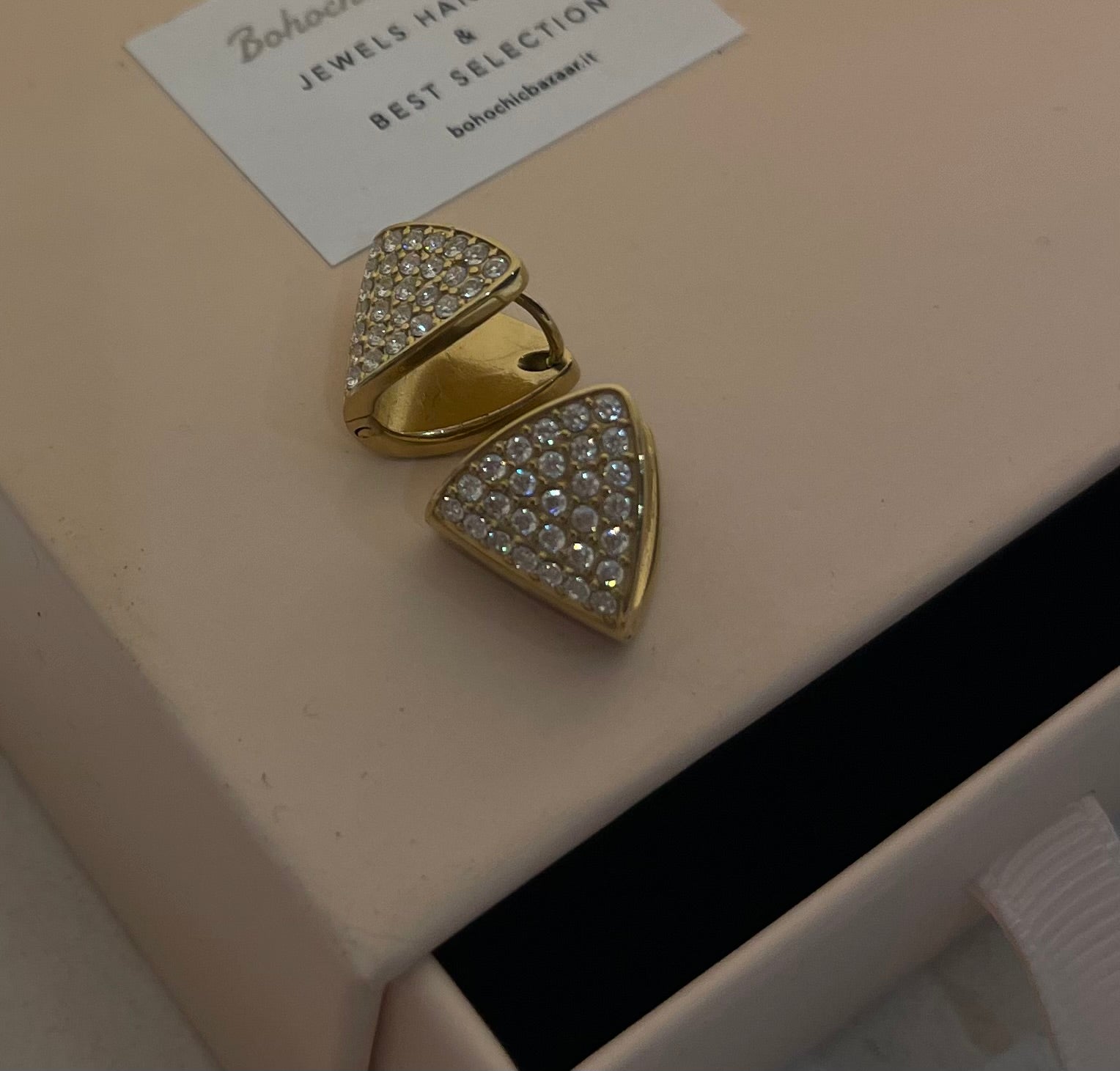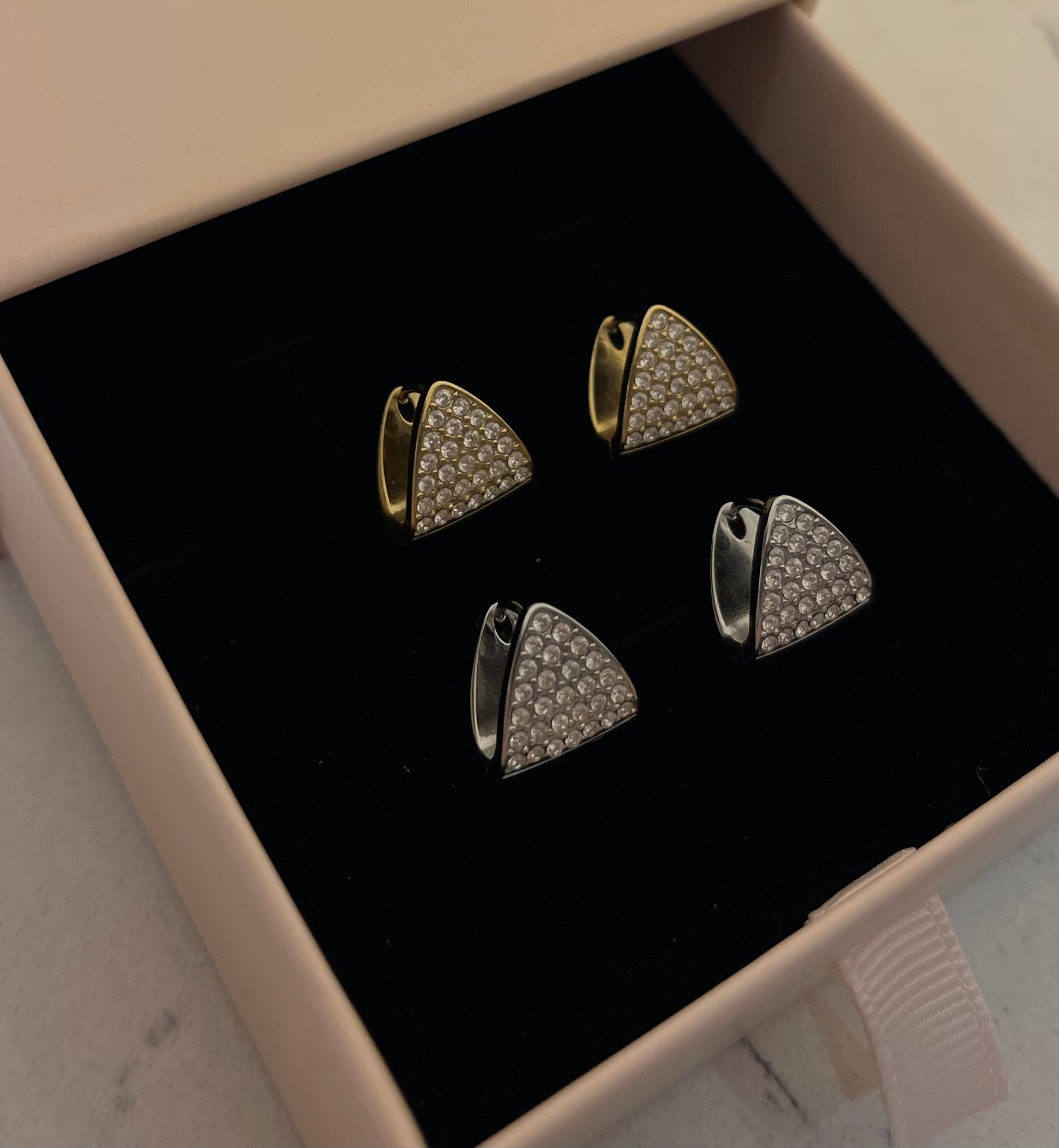 Orecchini triangolo zirconato a Lobo. Vintage designe. Chiusura a scatto . Il prezzo fa riferimento al paio.